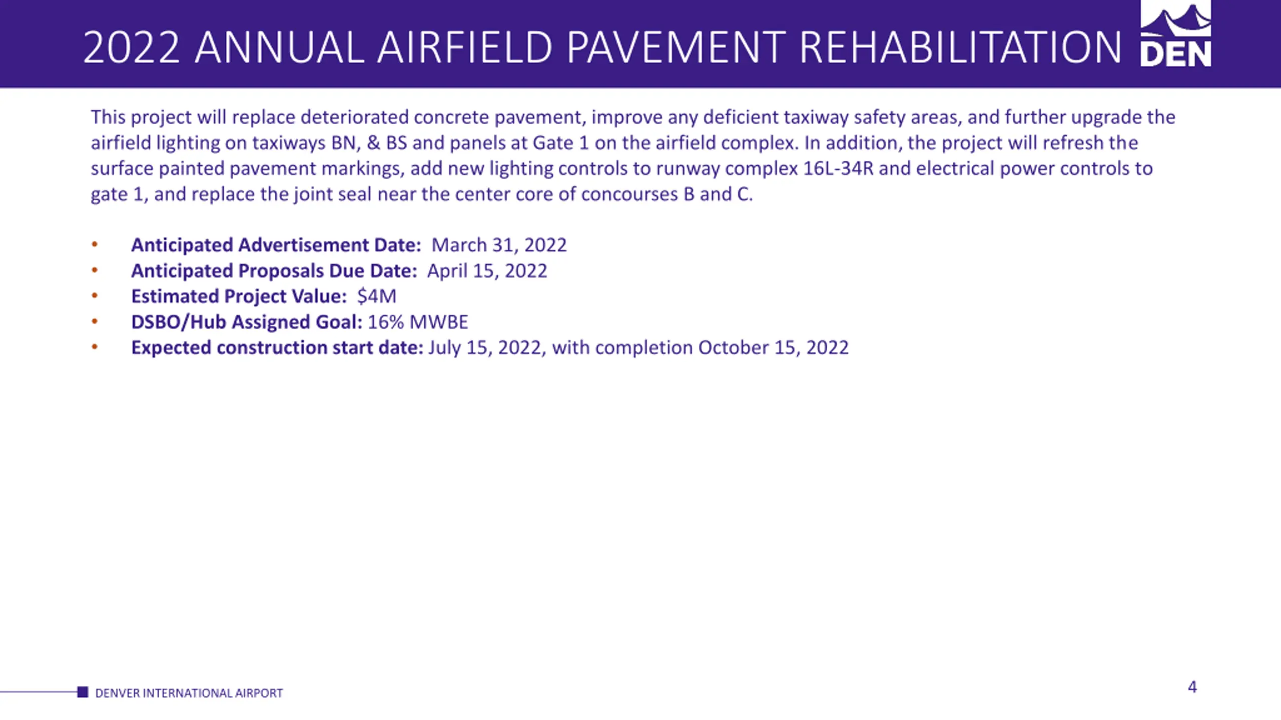 COMMISSIONING AND QUALITY ASSURANCE Scope Task-based contract Two procurements Main contract: Multiple award, $50M total capacity SBE Defined Pool: Single award, $5M capacity Primary focus on facilities projects Quality Assurance inspection Comply with CCD general contract conditions, Title 17 Excludes IBC chapter 17 special inspection Commissioning (Cx) New construction and remodel project Cx LEED project / Envision project Cx Monitoring-Based Cx, retro-Cx, envelope Cx Anticipated Advertisement Date: May 2, 2022 Anticipated Proposals Due Date: May 31, 2022 Estimated Project Value: $50,000,000 + $5,000,000 SBE DSBO/Hub Assigned Goal: 30% MWBE + 30% Self-Perform (SBE) Expected Construction Start Date: December 2022 3 DENVER INTERNATIONAL AIRPORT