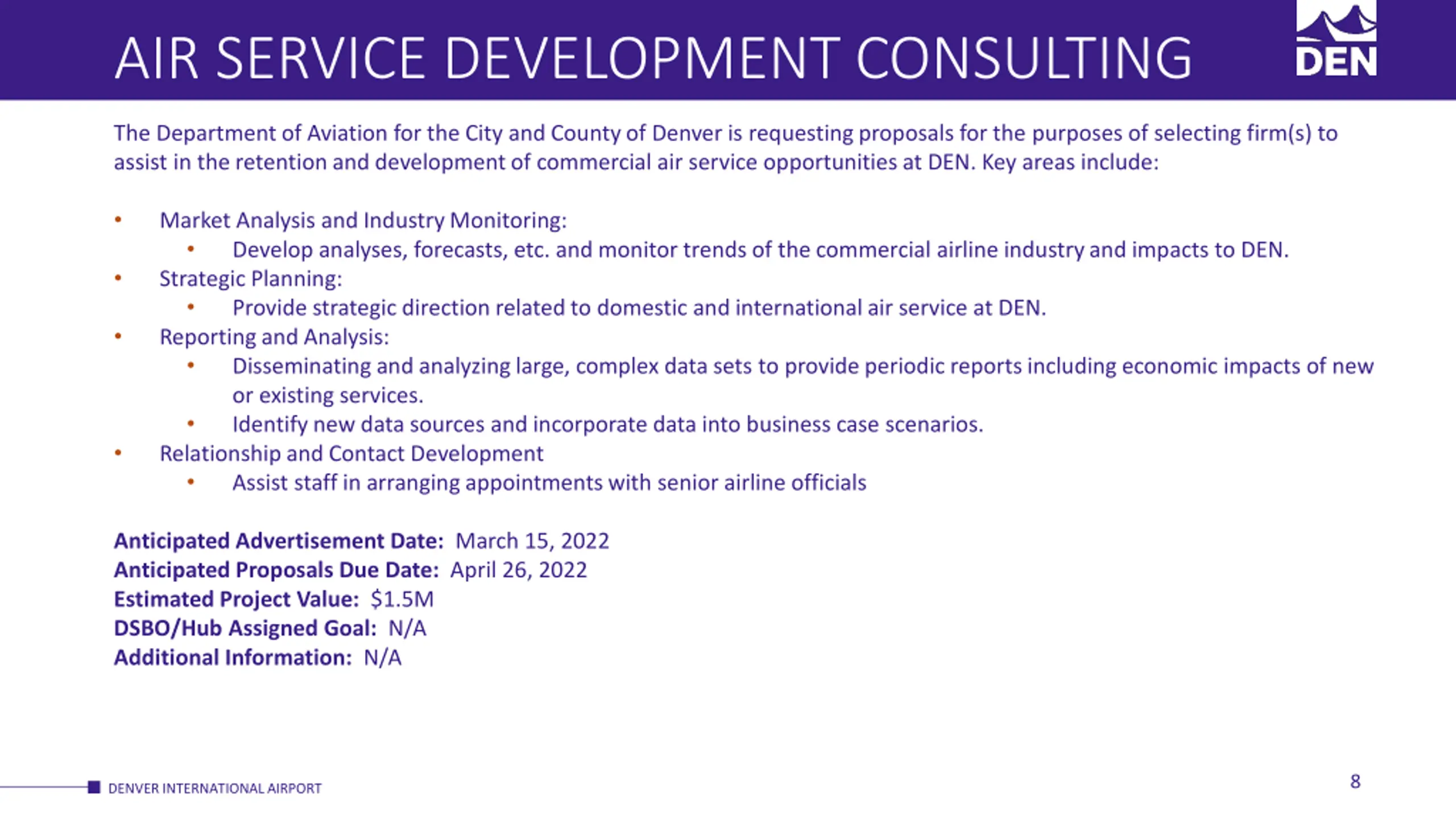 AIR SERVICE DEVELOPMENT CONSULTING The Department of Aviation for the City and County of Denver is requesting proposals for the purposes of selecting firm(s) to assist in the retention and development of commercial air service opportunities at DEN. Key areas include: Market Analysis and Industry Monitoring: Develop analyses, forecasts, etc. and monitor trends of the commercial airline industry and impacts to DEN. Strategic Planning: Provide strategic direction related to domestic and international air service at DEN. Reporting and Analysis: Disseminating and analyzing large, complex data sets to provide periodic reports including economic impacts of new or existing services. Identify new data sources and incorporate data into business case scenarios. Relationship and Contact Development Assist staff in arranging appointments with senior airline officials Anticipated Advertisement Date: March 15, 2022 Anticipated Proposals Due Date: April 26, 2022 Estimated Project Value: $1.5M DSBO/Hub Assigned Goal: N/A Additional Information: N/A 8 DENVER INTERNATIONAL AIRPORT