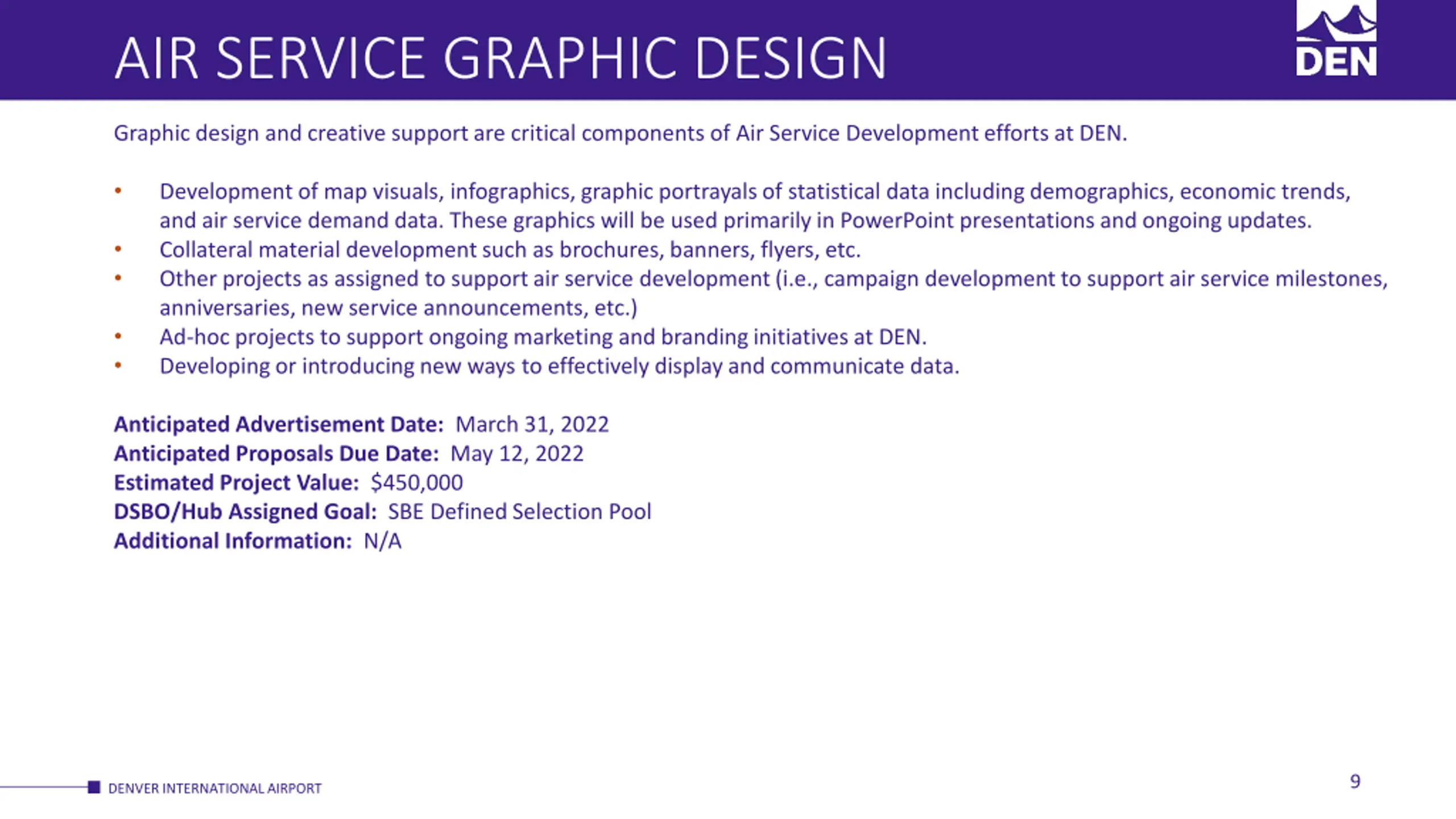 AIR SERVICE GRAPHIC DESIGN Graphic design and creative support are critical components of Air Service Development efforts at DEN. Development of map visuals, infographics, graphic portrayals of statistical data including demographics, economic trends, and air service demand data. These graphics will be used primarily in PowerPoint presentations and ongoing updates. Collateral material development such as brochures, banners, flyers, etc. Other projects as assigned to support air service development (i.e., campaign development to support air service milestones, anniversaries, new service announcements, etc.) Ad-hoc projects to support ongoing marketing and branding initiatives at DEN. Developing or introducing new ways to effectively display and communicate data. Anticipated Advertisement Date: March 31, 2022 Anticipated Proposals Due Date: May 12, 2022 Estimated Project Value: $450,000 DSBO/Hub Assigned Goal: SBE Defined Selection Pool Additional Information: N/A 9 DENVER INTERNATIONAL AIRPORT