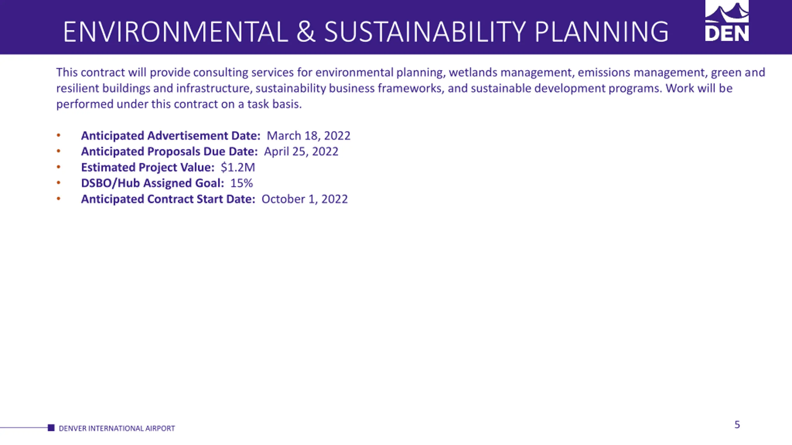 ENVIRONMENTAL & SUSTAINABILITY PLANNING This contract will provide consulting services for environmental planning, wetlands management, emissions management, green and resilient buildings and infrastructure, sustainability business frameworks, and sustainable development programs. Work will be performed under this contract on a task basis. Anticipated Advertisement Date: March 18, 2022 Anticipated Proposals Due Date: April 25, 2022 Estimated Project Value: $1.2M DSBO/Hub Assigned Goal: 15% Anticipated Contract Start Date: October 1, 2022 5 DENVER INTERNATIONAL AIRPORT