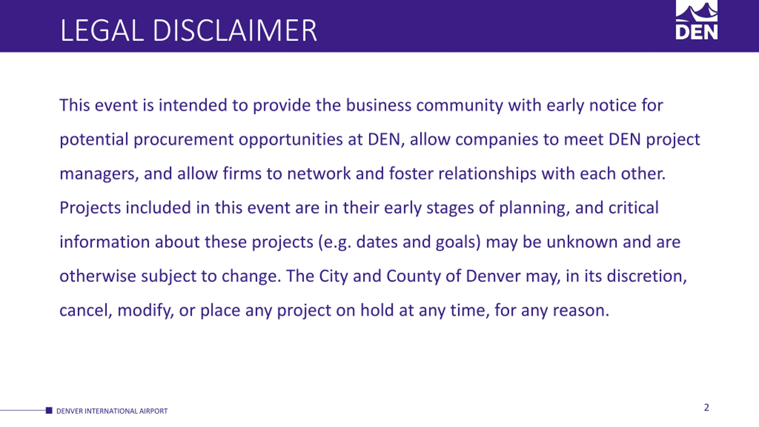 LEGAL DISCLAIMER This event is intended to provide the business community with early notice for potential procurement opportunities at DEN, allow companies to meet DEN project managers, and allow firms to network and foster relationships with each other. Projects included in this event are in their early stages of planning, and critical information about these projects (e.g. dates and goals) may be unknown and are otherwise subject to change. The City and County of Denver may, in its discretion, cancel, modify, or place any project on hold at any time, for any reason. 2 DENVER INTERNATIONAL AIRPORT