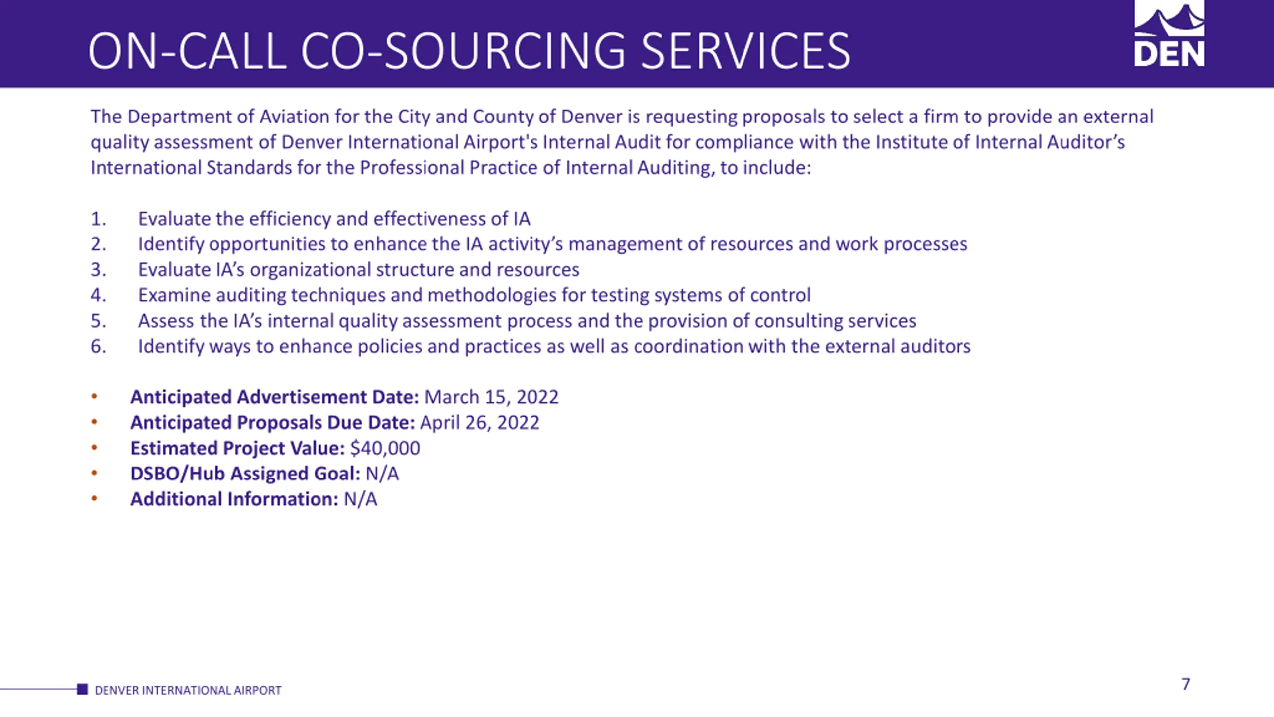 ON-CALL CO-SOURCING SERVICES The Department of Aviation for the City and County of Denver is requesting proposals to select a firm to provide an external quality assessment of Denver International Airport's Internal Audit for compliance with the Institute of Internal Auditor s International Standards for the Professional Practice of Internal Auditing, to include: 1. 2. 3. 4. 5. 6. Evaluate the efficiency and effectiveness of IA Identify opportunities to enhance the IA activity s management of resources and work processes Evaluate IA s organizational structure and resources Examine auditing techniques and methodologies for testing systems of control Assess the IA s internal quality assessment process and the provision of consulting services Identify ways to enhance policies and practices as well as coordination with the external auditors Anticipated Advertisement Date: March 15, 2022 Anticipated Proposals Due Date: April 26, 2022 Estimated Project Value: $40,000 DSBO/Hub Assigned Goal: N/A Additional Information: N/A 7 DENVER INTERNATIONAL AIRPORT