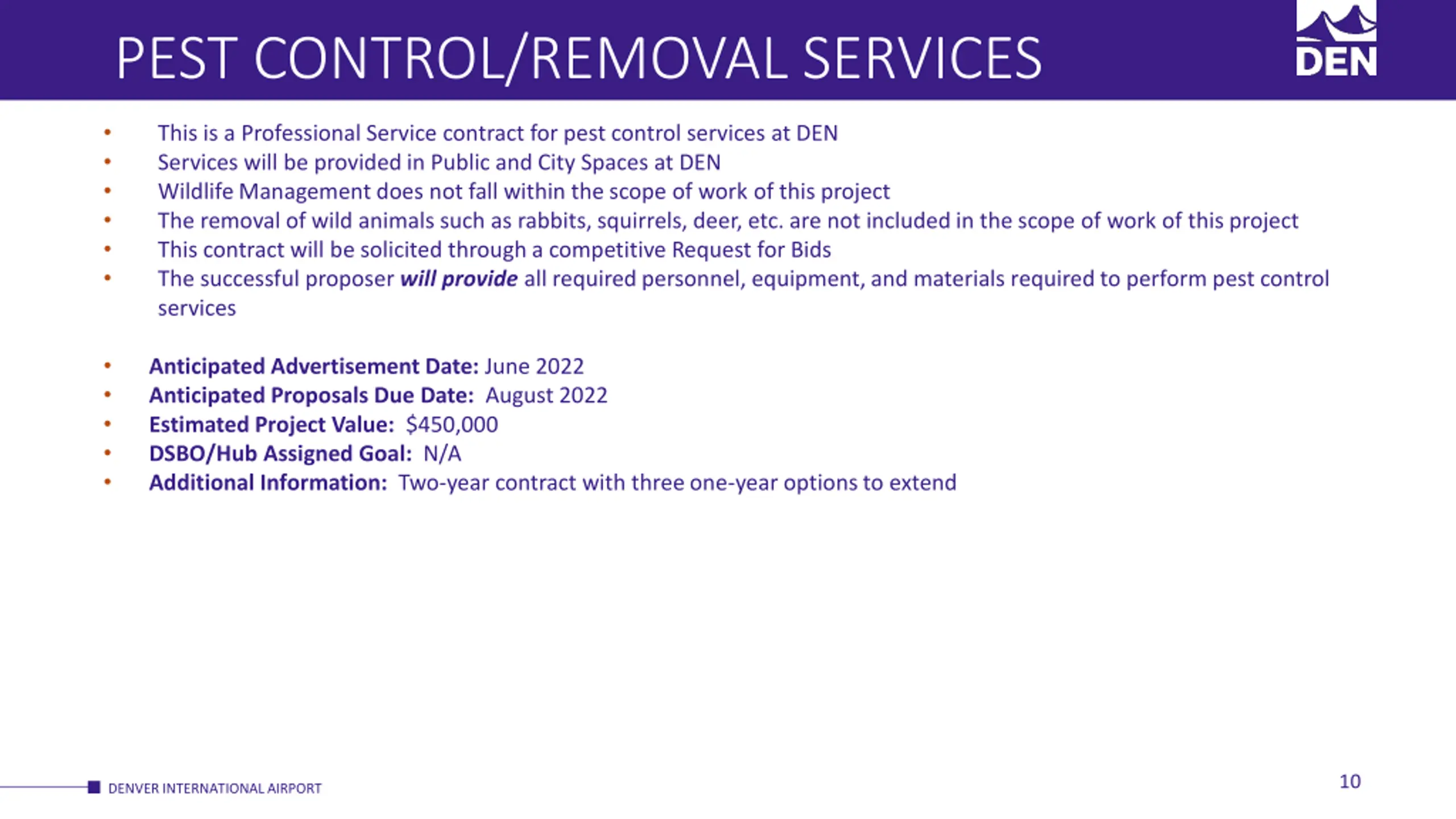 PEST CONTROL/REMOVAL SERVICES This is a Professional Service contract for pest control services at DEN Services will be provided in Public and City Spaces at DEN Wildlife Management does not fall within the scope of work of this project The removal of wild animals such as rabbits, squirrels, deer, etc. are not included in the scope of work of this project This contract will be solicited througha competitive Request for Bids The successful proposer will provide all requiredpersonnel, equipment, and materials requiredto perform pest control services Anticipated Advertisement Date: June 2022 Anticipated Proposals Due Date: August 2022 Estimated Project Value: $450,000 DSBO/Hub Assigned Goal: N/A Additional Information: Two-year contract with three one-year options to extend 10 DENVER INTERNATIONAL AIRPORT