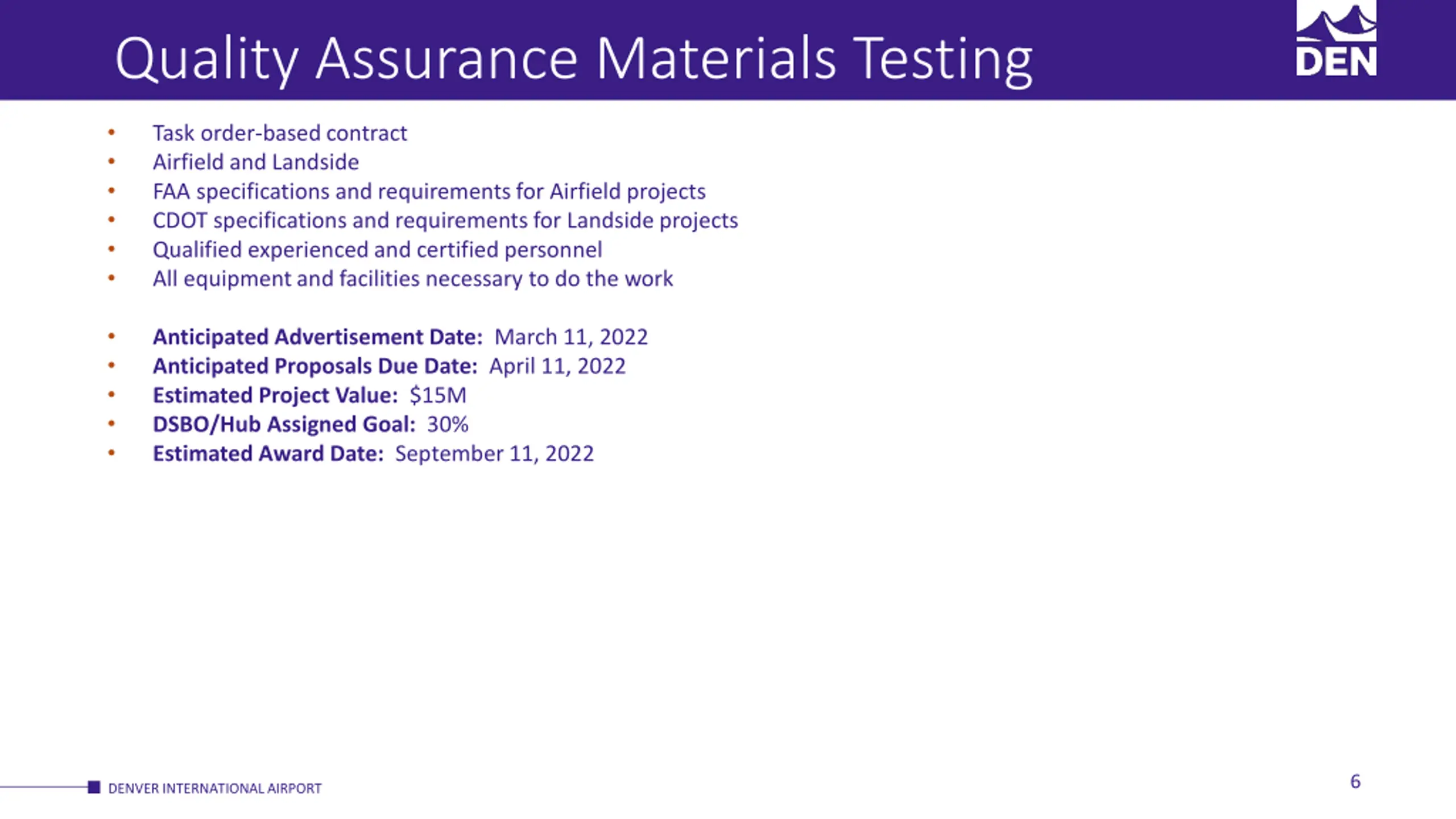 Quality Assurance Materials Testing Task order-based contract Airfield and Landside FAA specifications and requirements for Airfield projects CDOT specifications and requirements for Landside projects Qualified experienced and certified personnel All equipment and facilities necessary to do the work Anticipated Advertisement Date: March 11, 2022 Anticipated Proposals Due Date: April 11, 2022 Estimated Project Value: $15M DSBO/Hub Assigned Goal: 30% Estimated Award Date: September 11, 2022 6 DENVER INTERNATIONAL AIRPORT