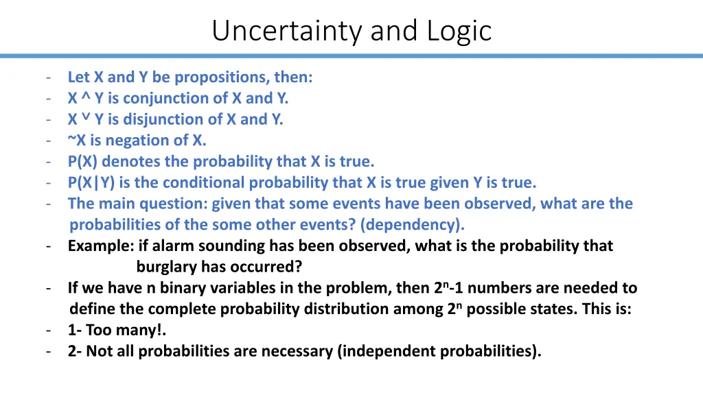 Uncertainty and Logic - - - - - - - probabilities of the some other events? (dependency). - Example: if alarm sounding has been observed, what is the probability that burglary has occurred? - If we have n binary variables in the problem, then 2n-1 numbers are needed to define the complete probability distribution among 2n possible states. This is: - 1- Too many!. - 2- Not all probabilities are necessary (independent probabilities). Let X and Y be propositions, then: X Y is conjunction of X and Y. X Y is disjunction of X and Y. ~X is negation of X. P(X) denotes the probability that X is true. P(X|Y) is the conditional probability that X is true given Y is true. The main question: given that some events have been observed, what are the