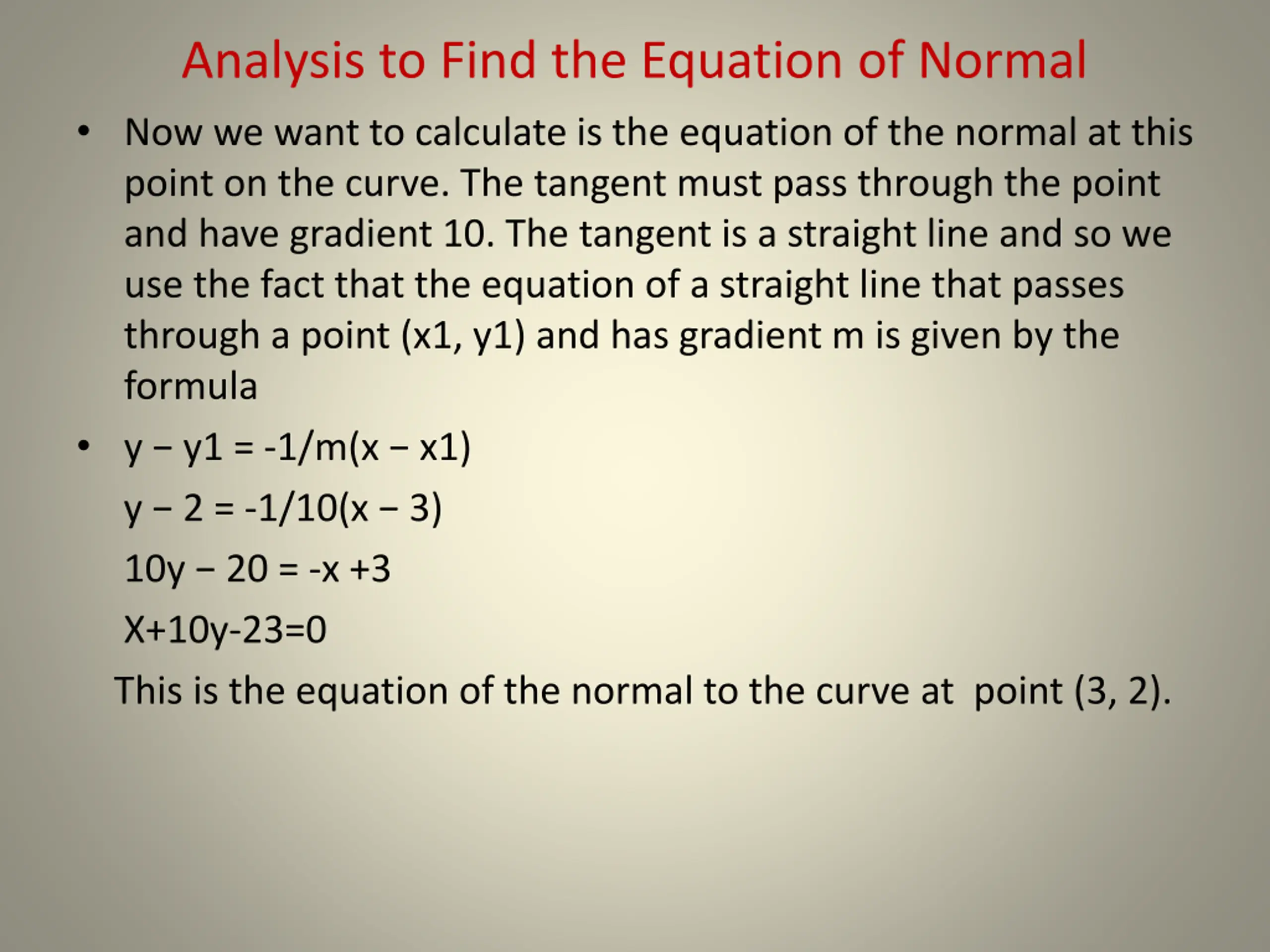 Analysis to Find the Equation of Normal Now we want to calculate is the equation of the normal at this point on the curve. The tangent must pass through the point and have gradient 10. The tangent is a straight line and so we use the fact that the equation of a straight line that passes through a point (x1, y1) and has gradient m is given by the formula y y1 = -1/m(x x1) y 2 = -1/10(x 3) 10y 20 = -x +3 X+10y-23=0 This is the equation of the normal to the curve at point (3, 2).