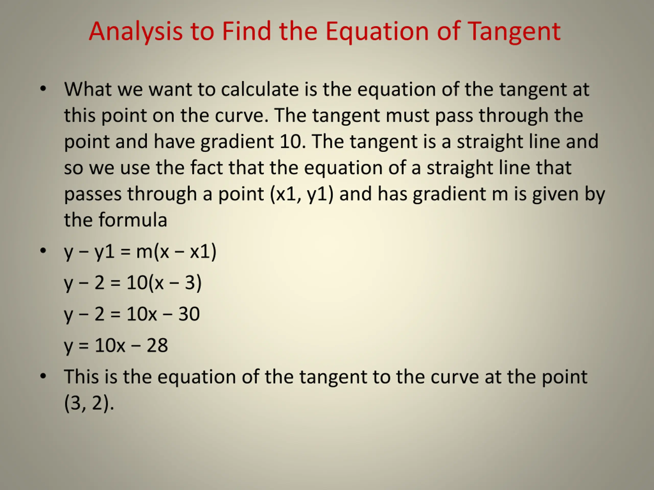 Analysis to Find the Equation of Tangent What we want to calculate is the equation of the tangent at this point on the curve. The tangent must pass through the point and have gradient 10. The tangent is a straight line and so we use the fact that the equation of a straight line that passes through a point (x1, y1) and has gradient m is given by the formula y y1 = m(x x1) y 2 = 10(x 3) y 2 = 10x 30 y = 10x 28 This is the equation of the tangent to the curve at the point (3, 2).