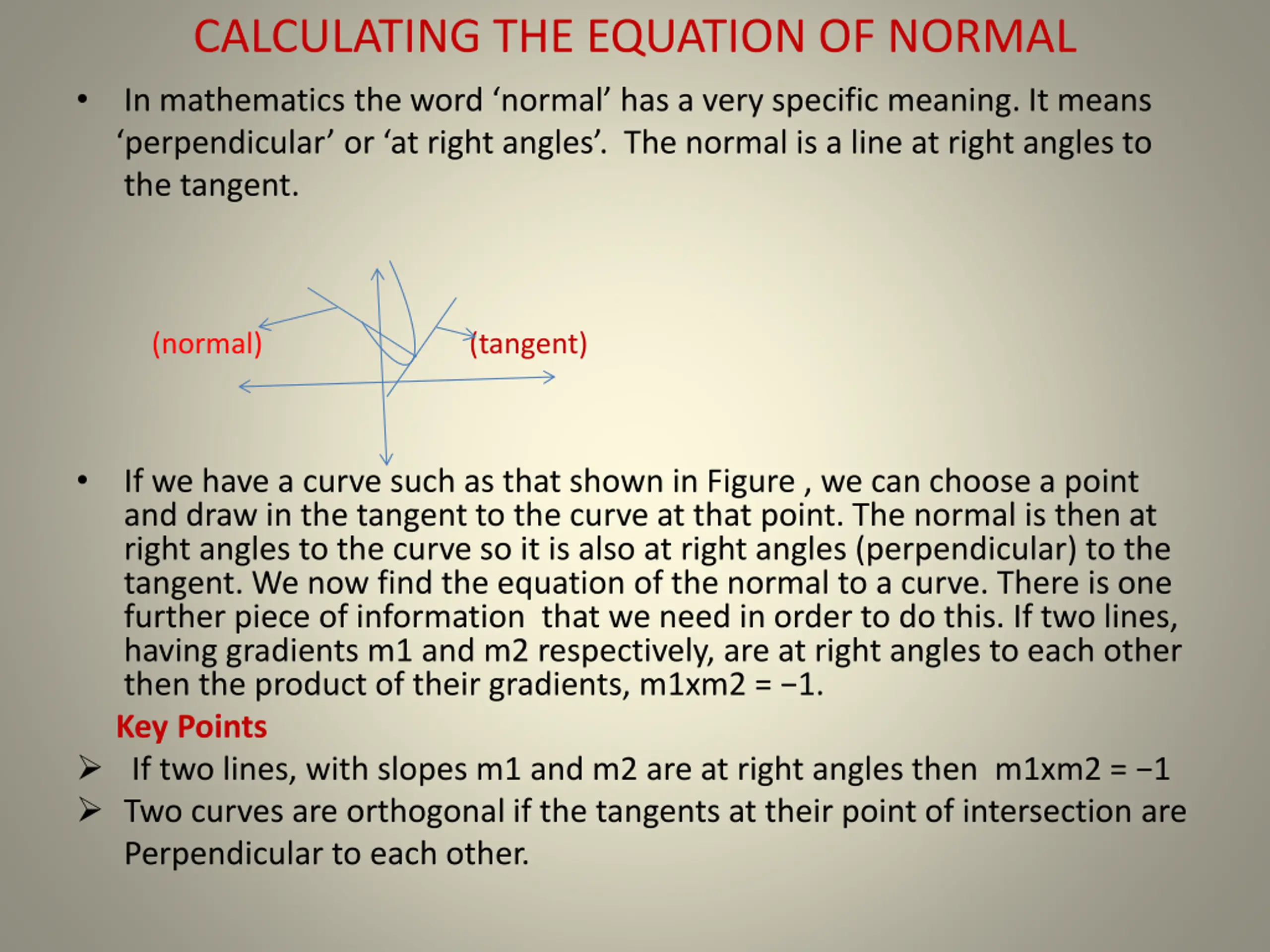 CALCULATING THE EQUATION OF NORMAL perpendicular or at right angles . The normal is a line at right angles to the tangent. In mathematics the word normal has a very specific meaning. It means (normal) (tangent) If we have a curve such as that shown in Figure , we can choose a point and draw in the tangent to the curve at that point. The normal is then at right angles to the curve so it is also at right angles (perpendicular) to the tangent. We now find the equation of the normal to a curve. There is one further piece of information that we need in order to do this. If two lines, having gradients m1 and m2 respectively, are at right angles to each other then the product of their gradients, m1xm2 = 1. Key Points If two lines, with slopes m1 and m2 are at right angles then m1xm2 = 1 Two curves are orthogonal if the tangents at their point of intersection are Perpendicular to each other.