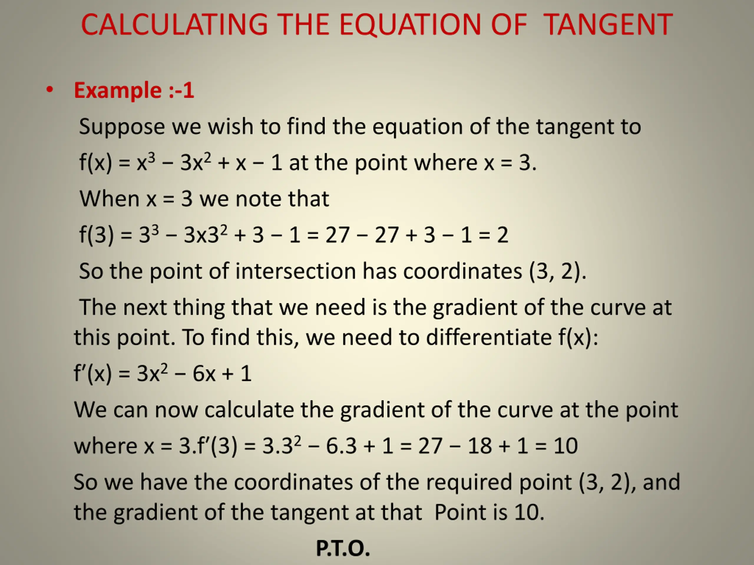CALCULATING THE EQUATION OF TANGENT Example :-1 Suppose we wish to find the equation of the tangent to f(x) = x3 3x2+ x 1 at the point where x = 3. When x = 3 we note that f(3) = 33 3x32+ 3 1 = 27 27 + 3 1 = 2 So the point of intersection has coordinates (3, 2). The next thing that we need is the gradient of the curve at this point. To find this, we need to differentiate f(x): f (x) = 3x2 6x + 1 We can now calculate the gradient of the curve at the point where x = 3.f (3) = 3.32 6.3 + 1 = 27 18 + 1 = 10 So we have the coordinates of the required point (3, 2), and the gradient of the tangent at that Point is 10. P.T.O.