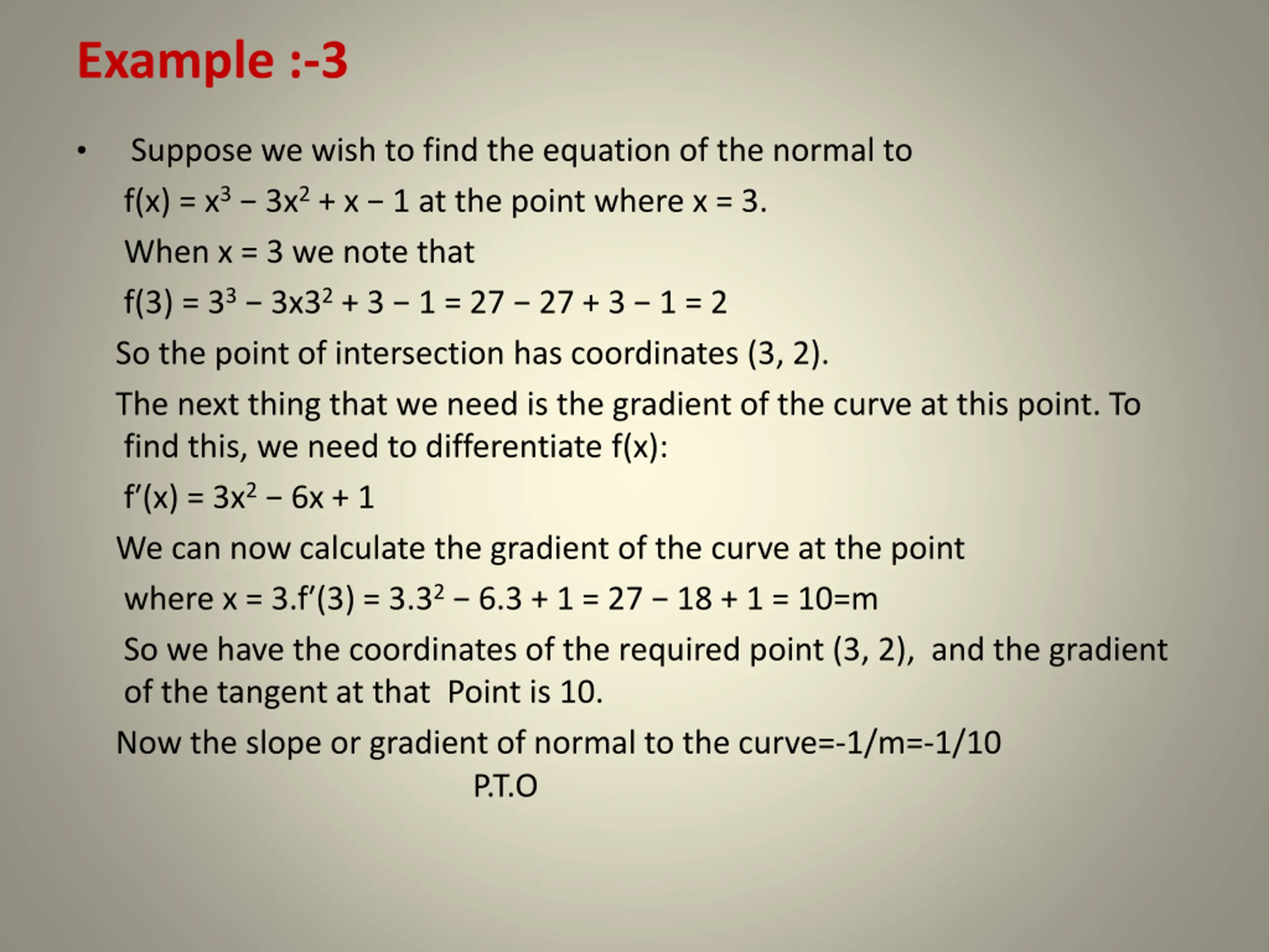 Example :-3 f(x) = x3 3x2+ x 1 at the point where x = 3. When x = 3 we note that f(3) = 33 3x32+ 3 1 = 27 27 + 3 1 = 2 So the point of intersection has coordinates (3, 2). The next thing that we need is the gradient of the curve at this point. To find this, we need to differentiate f(x): f (x) = 3x2 6x + 1 We can now calculate the gradient of the curve at the point where x = 3.f (3) = 3.32 6.3 + 1 = 27 18 + 1 = 10=m So we have the coordinates of the required point (3, 2), and the gradient of the tangent at that Point is 10. Now the slope or gradient of normal to the curve=-1/m=-1/10 P.T.O Suppose we wish to find the equation of the normal to