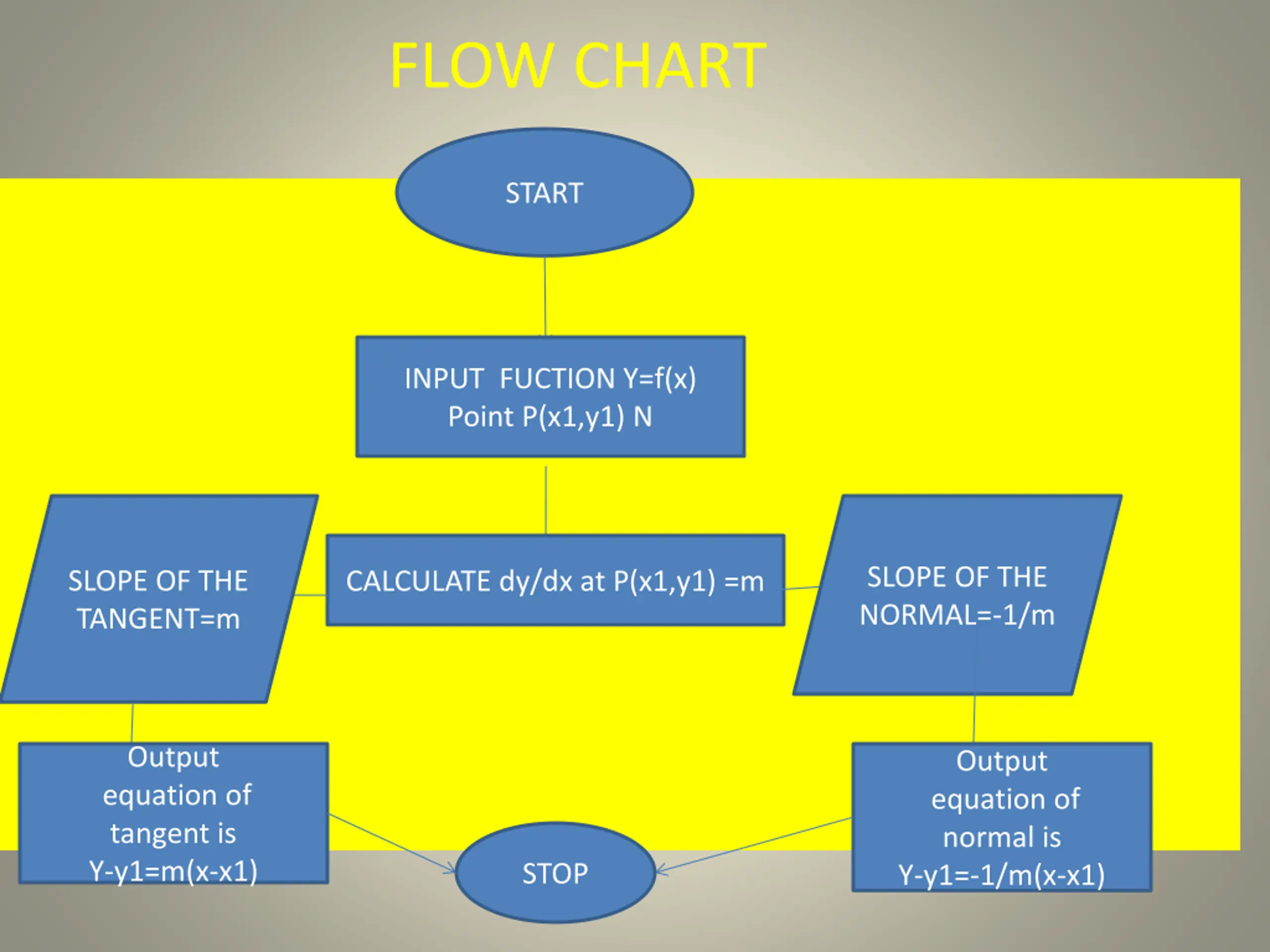 FLOW CHART START INPUT FUCTION Y=f(x) Point P(x1,y1) N SLOPE OF THE NORMAL=-1/m SLOPE OF THE TANGENT=m CALCULATE dy/dx at P(x1,y1) =m Output equation of tangent is Y-y1=m(x-x1) Output equation of normal is Y-y1=-1/m(x-x1) STOP