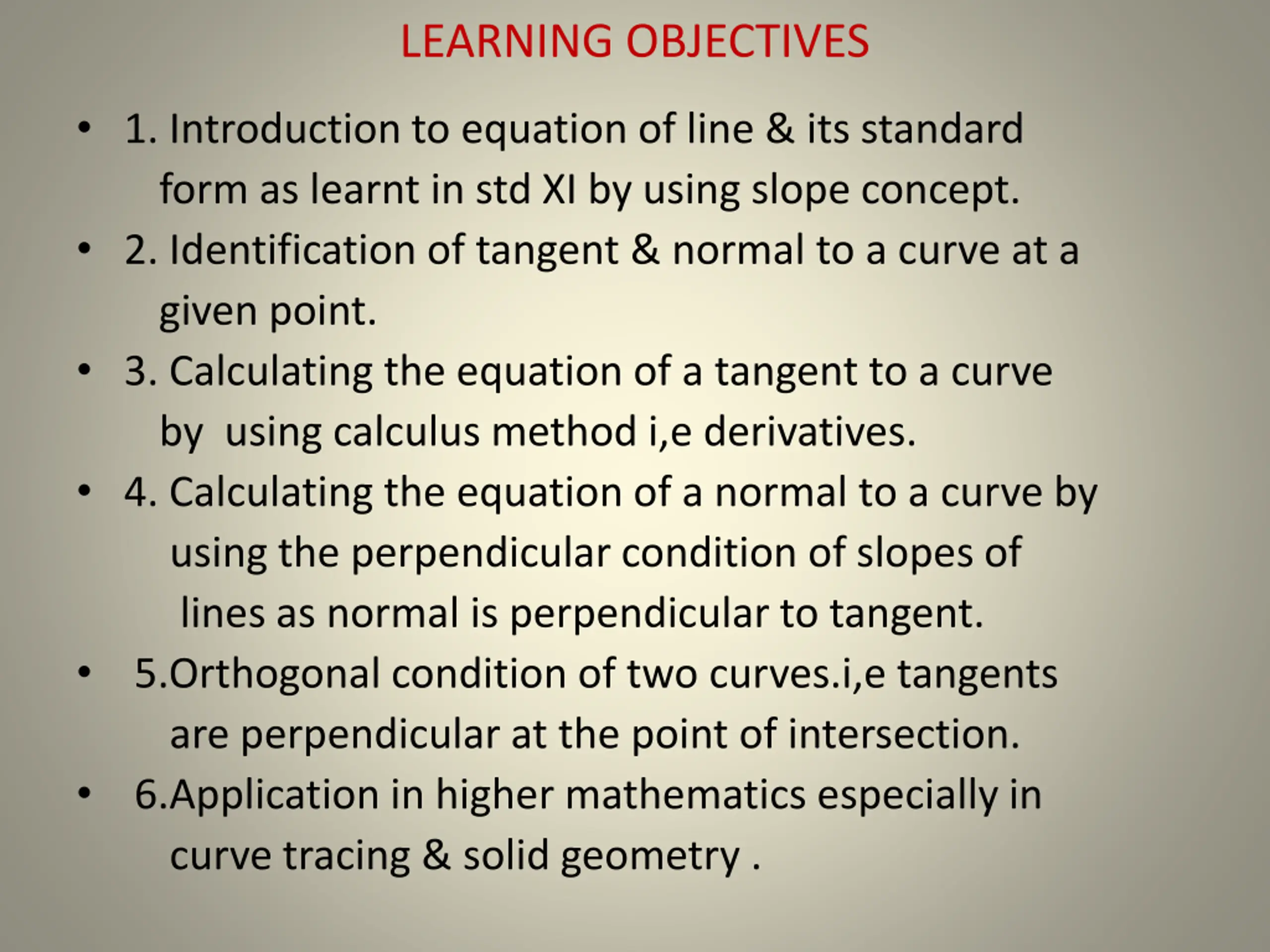 LEARNING OBJECTIVES 1. Introduction to equation of line & its standard form as learnt in std XI by using slope concept. 2. Identification of tangent & normal to a curve at a given point. 3. Calculating the equation of a tangent to a curve by using calculus method i,e derivatives. 4. Calculating the equation of a normal to a curve by using the perpendicular condition of slopes of lines as normal is perpendicular to tangent. 5.Orthogonal condition of two curves.i,e tangents are perpendicular at the point of intersection. 6.Application in higher mathematics especially in curve tracing & solid geometry .