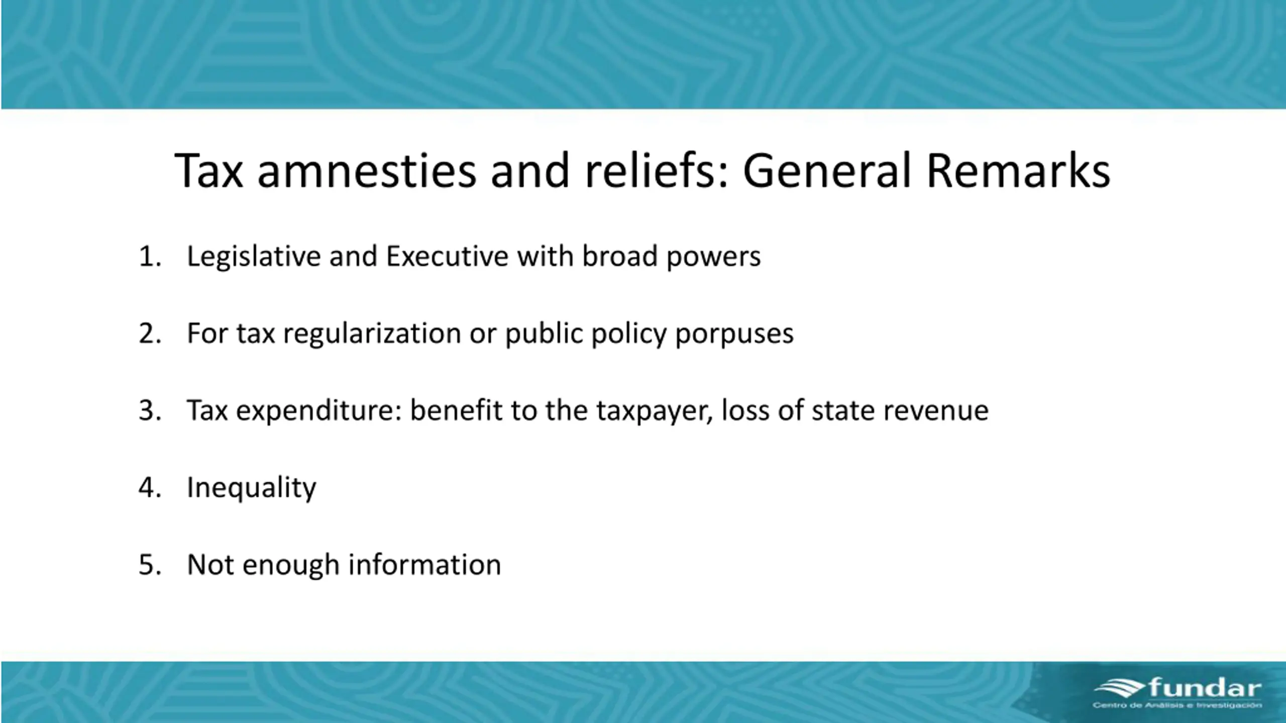 Tax amnesties and reliefs: General Remarks 1. Legislative and Executive with broad powers 2. For tax regularization or public policy porpuses 3. Tax expenditure: benefit to the taxpayer, loss of state revenue 4. Inequality 5. Not enough information