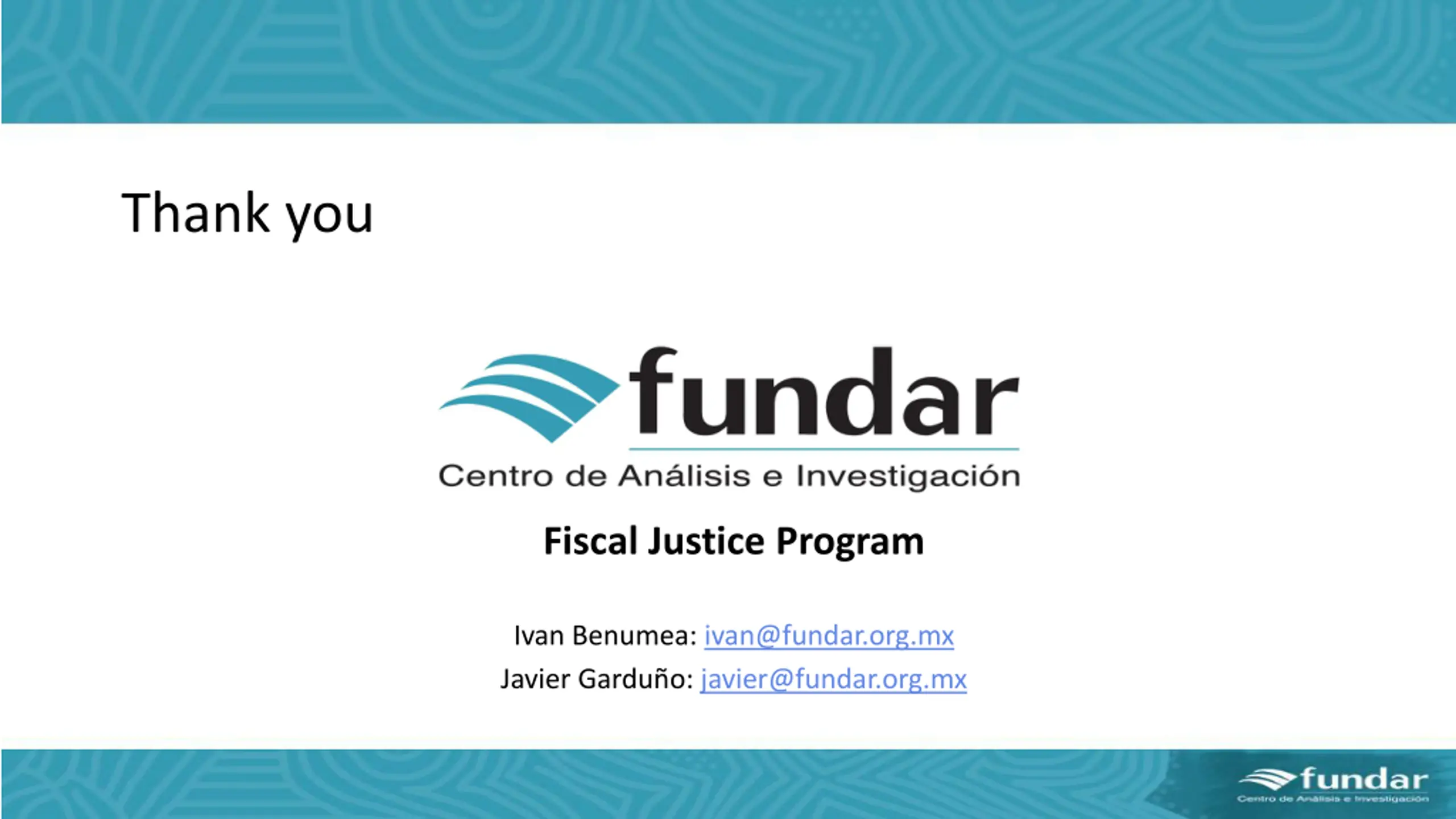 Thank you Fiscal Justice Program Ivan Benumea: ivan@fundar.org.mx Javier Gardu o: javier@fundar.org.mx