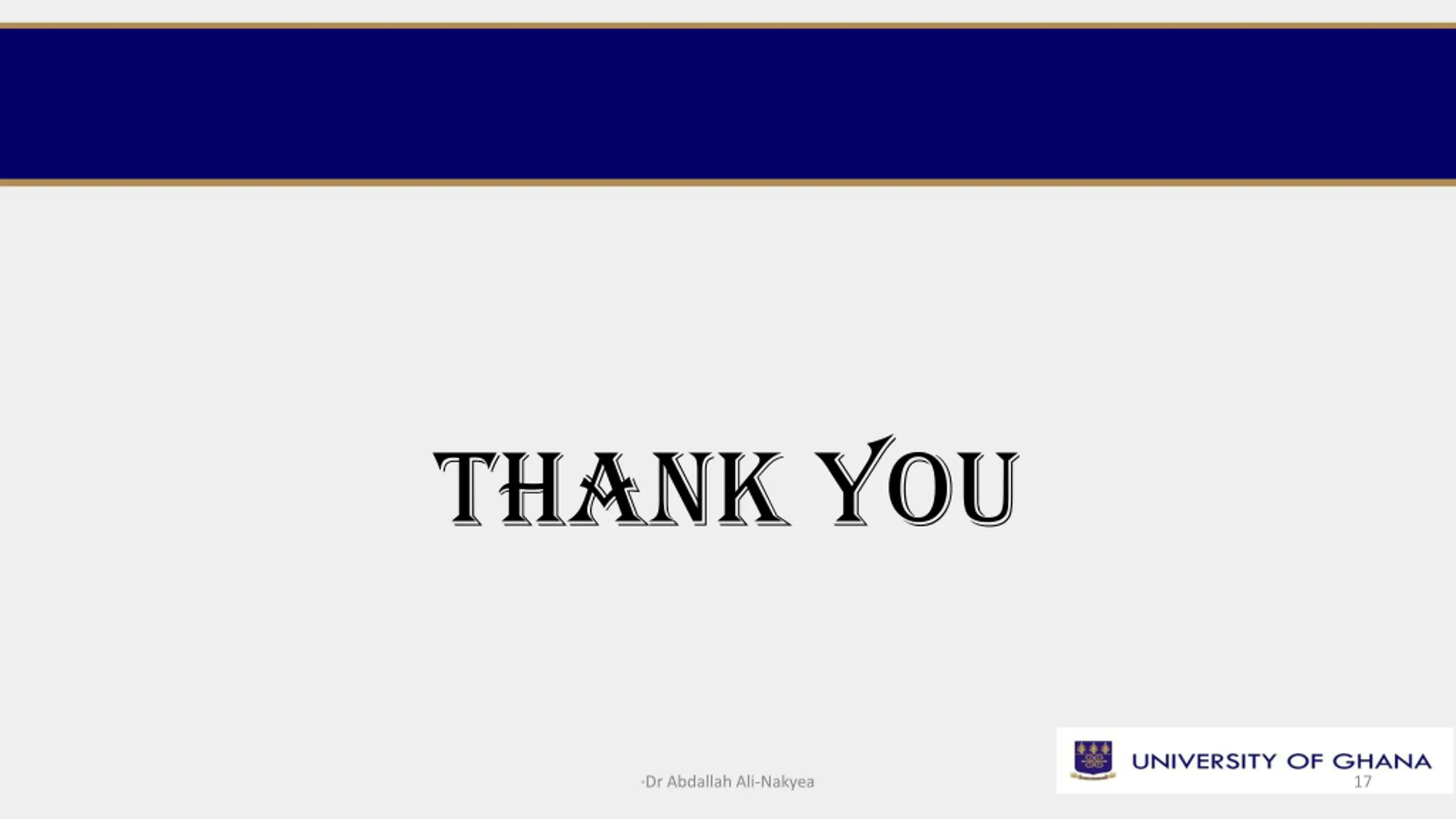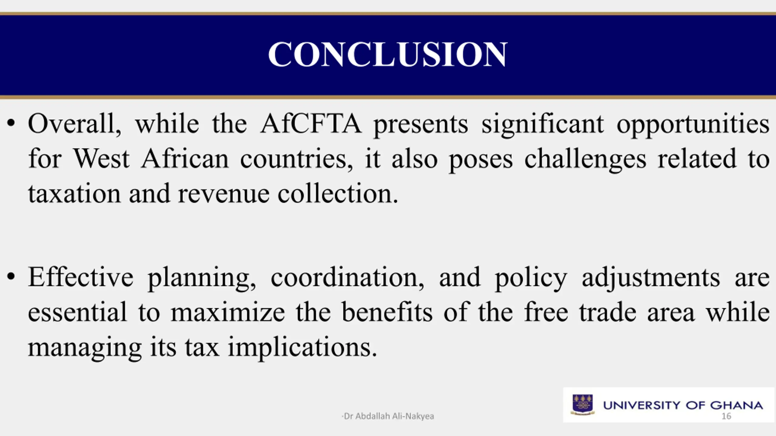 CONCLUSION Overall, while the AfCFTA presents significant opportunities for West African countries, it also poses challenges related to taxation and revenue collection. Effective planning, coordination, and policy adjustments are essential to maximize the benefits of the free trade area while managing its tax implications. Dr Abdallah Ali-Nakyea 16