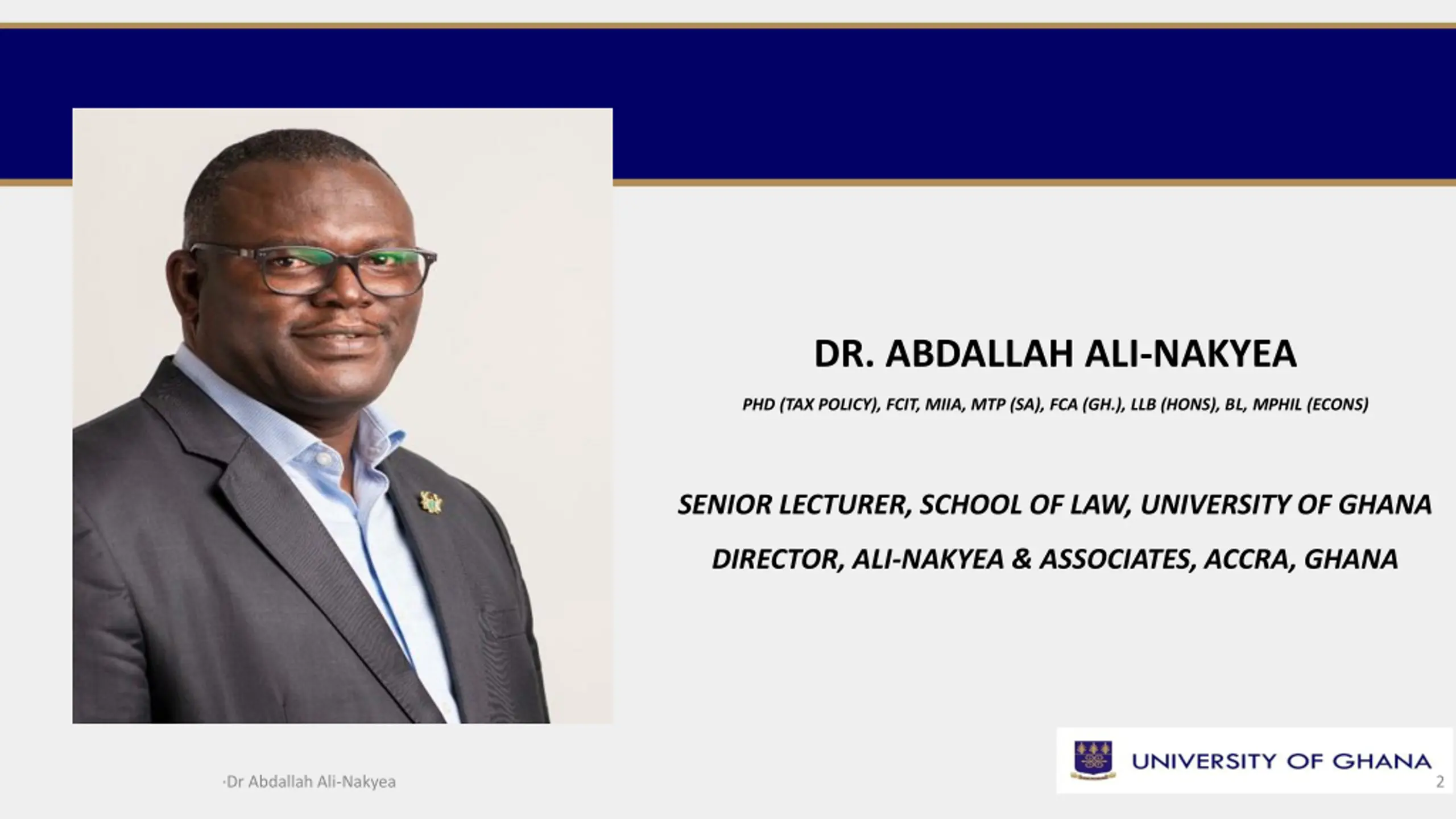 DR. ABDALLAH ALI-NAKYEA PHD (TAX POLICY), FCIT, MIIA, MTP (SA), FCA (GH.), LLB (HONS), BL, MPHIL (ECONS) SENIOR LECTURER, SCHOOL OF LAW, UNIVERSITY OF GHANA DIRECTOR, ALI-NAKYEA & ASSOCIATES, ACCRA, GHANA Dr Abdallah Ali-Nakyea 2