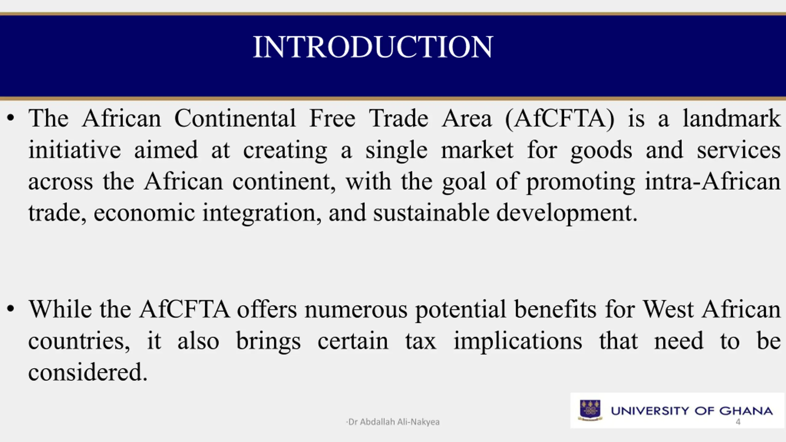 INTRODUCTION The African Continental Free Trade Area (AfCFTA) is a landmark initiative aimed at creating a single market for goods and services across the African continent, with the goal of promoting intra-African trade, economic integration, and sustainable development. While the AfCFTA offers numerous potential benefits for West African countries, it also brings certain tax implications that need to be considered. Dr Abdallah Ali-Nakyea 4