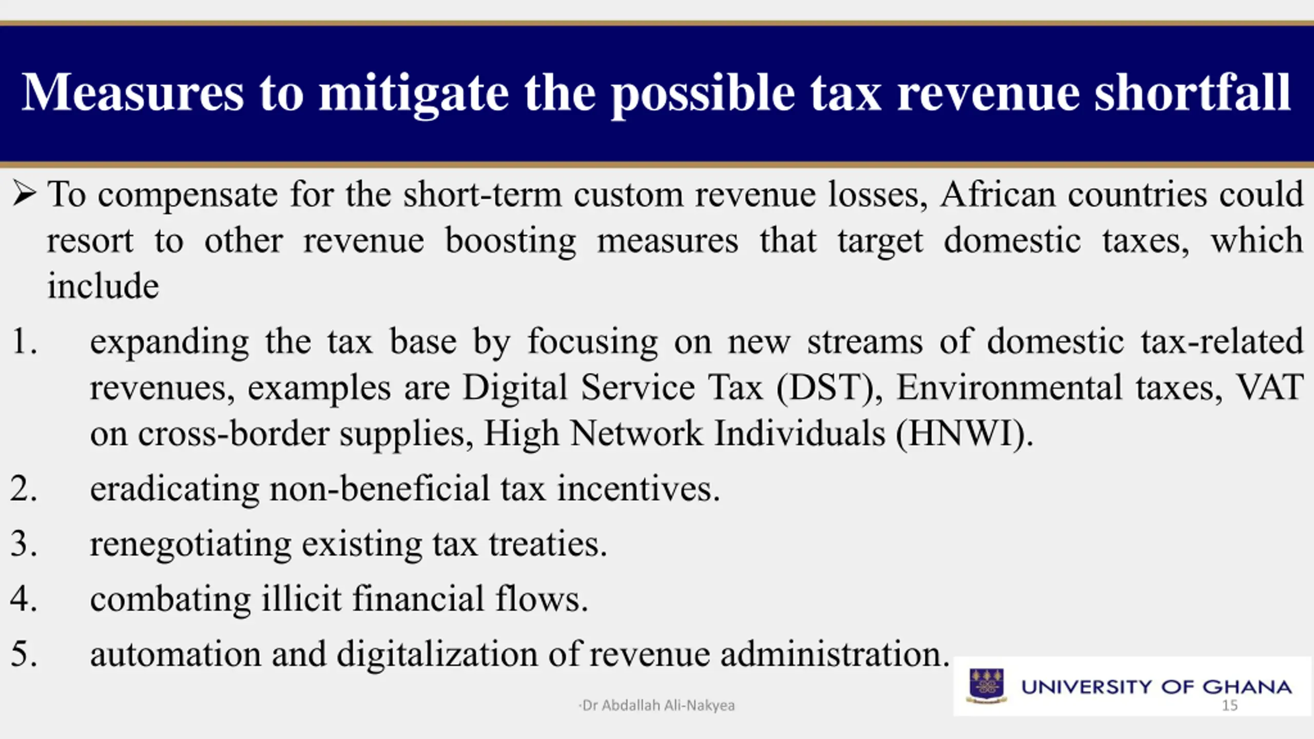Measures to mitigate the possible tax revenue shortfall To compensate for the short-term custom revenue losses, African countries could resort to other revenue boosting measures that target domestic taxes, which include 1. expanding the tax base by focusing on new streams of domestic tax-related revenues, examples are Digital Service Tax (DST), Environmental taxes, VAT on cross-border supplies, High Network Individuals (HNWI). 2. eradicating non-beneficial tax incentives. 3. renegotiating existing tax treaties. 4. combating illicit financial flows. 5. automation and digitalization of revenue administration. Dr Abdallah Ali-Nakyea 15