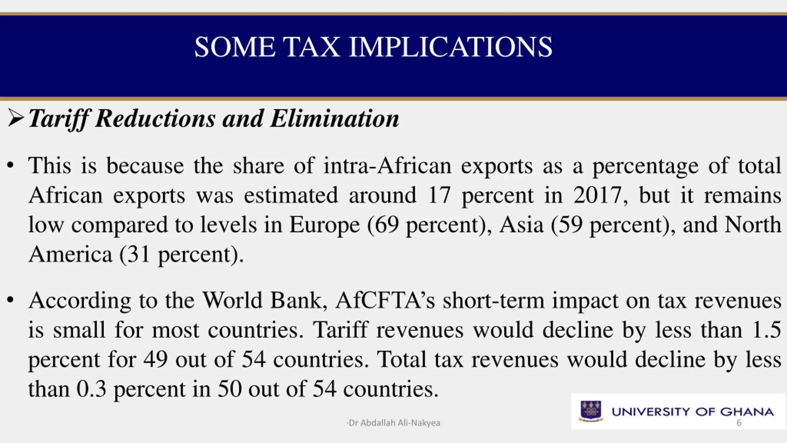 SOME TAX IMPLICATIONS Tariff Reductions and Elimination This is because the share of intra-African exports as a percentage of total African exports was estimated around 17 percent in 2017, but it remains low compared to levels in Europe (69 percent), Asia (59 percent), and North America (31 percent). According to the World Bank, AfCFTA s short-term impact on tax revenues is small for most countries. Tariff revenues would decline by less than 1.5 percent for 49 out of 54 countries. Total tax revenues would decline by less than 0.3 percent in 50 out of 54 countries. Dr Abdallah Ali-Nakyea 6