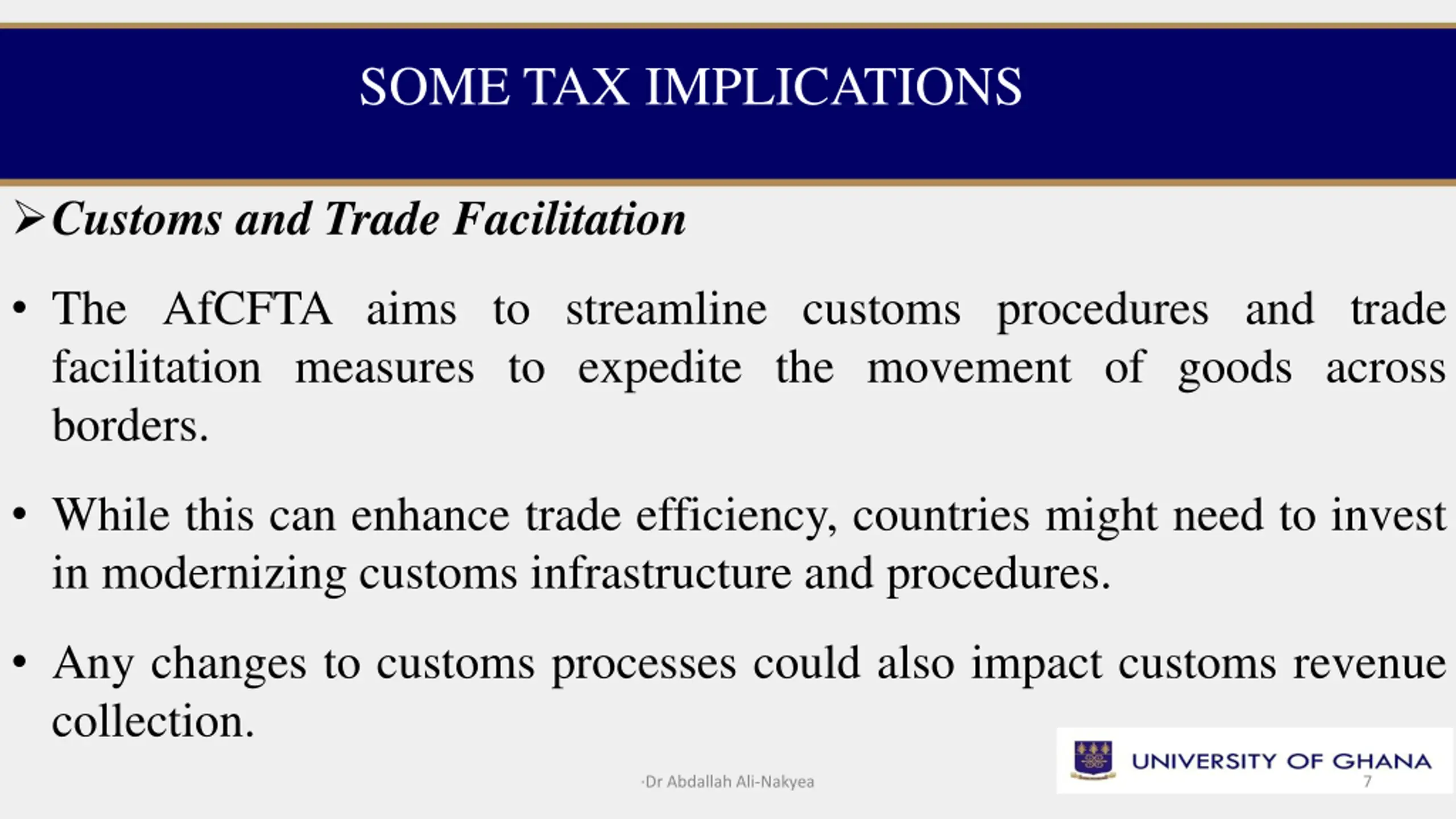 SOME TAX IMPLICATIONS Customs and Trade Facilitation The AfCFTA aims to streamline customs procedures and trade facilitation measures to expedite the movement of goods across borders. While this can enhance trade efficiency, countries might need to invest in modernizing customs infrastructure and procedures. Any changes to customs processes could also impact customs revenue collection. Dr Abdallah Ali-Nakyea 7