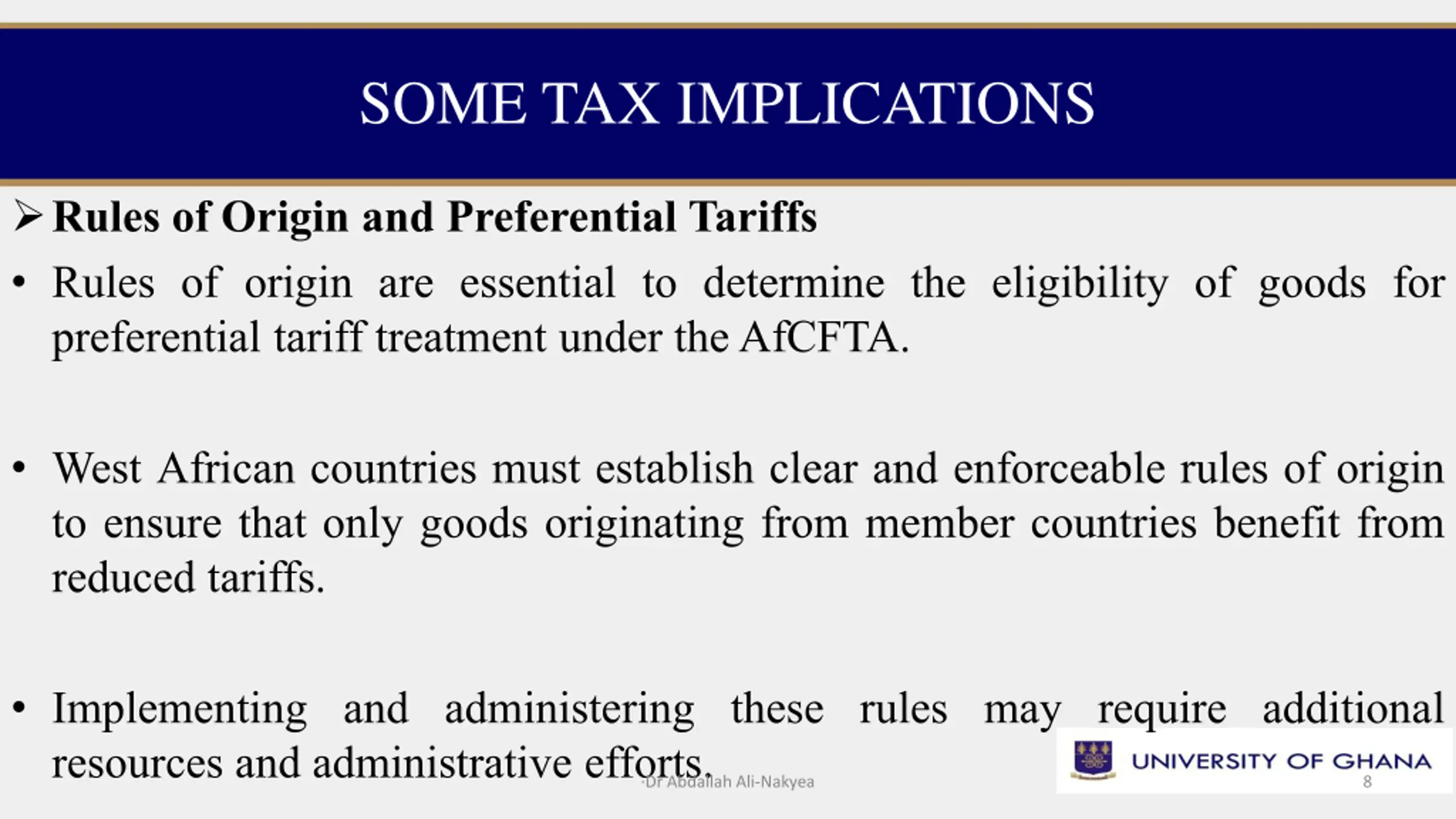 SOME TAX IMPLICATIONS Rules of Origin and Preferential Tariffs Rules of origin are essential to determine the eligibility of goods for preferential tariff treatment under the AfCFTA. West African countries must establish clear and enforceable rules of origin to ensure that only goods originating from member countries benefit from reduced tariffs. Implementing and administering these rules may require additional resources and administrative efforts. Dr Abdallah Ali-Nakyea 8