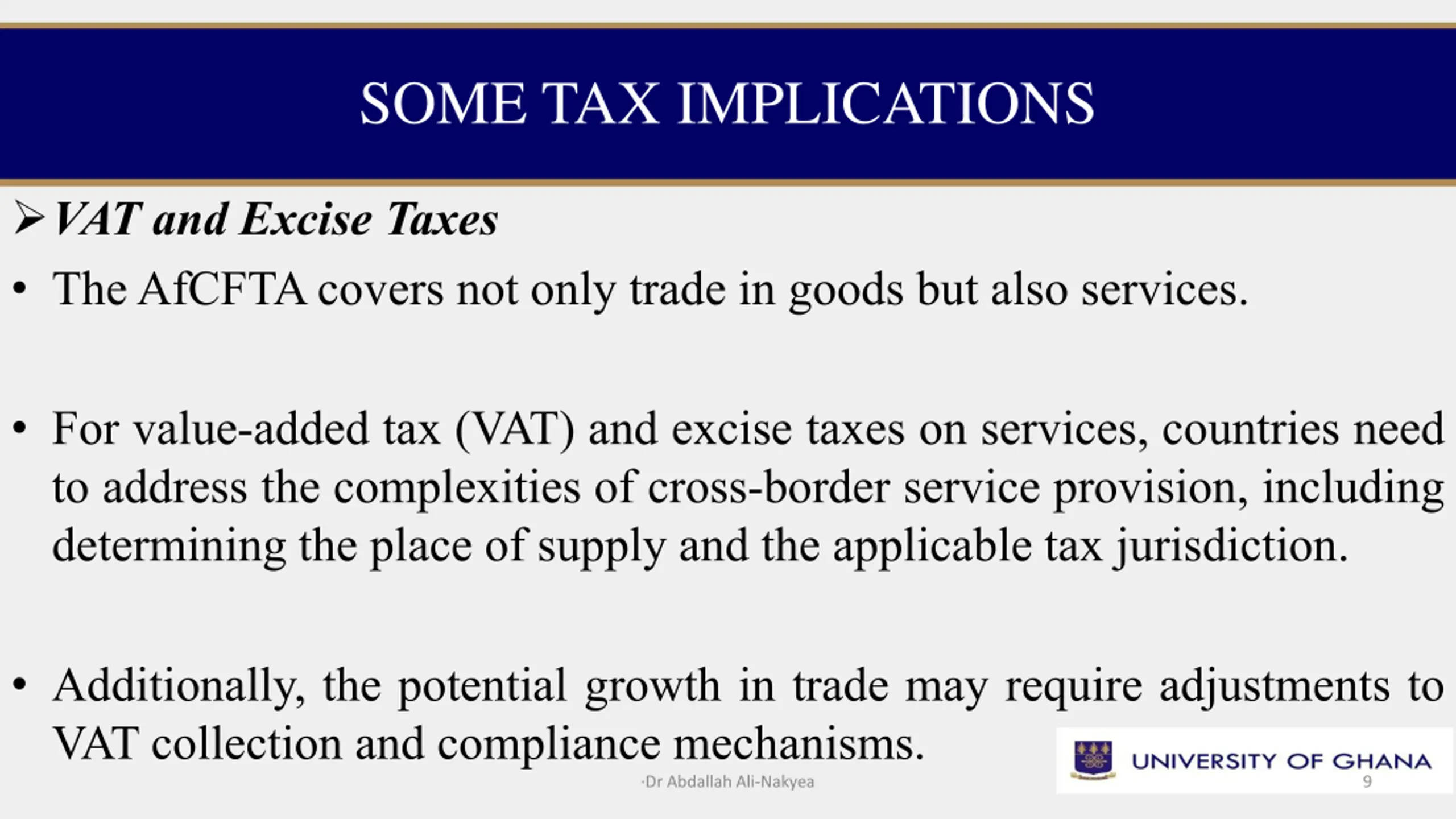 SOME TAX IMPLICATIONS VAT and Excise Taxes The AfCFTA covers not only trade in goods but also services. For value-added tax (VAT) and excise taxes on services, countries need to address the complexities of cross-border service provision, including determining the place of supply and the applicable tax jurisdiction. Additionally, the potential growth in trade may require adjustments to VAT collection and compliance mechanisms. Dr Abdallah Ali-Nakyea 9