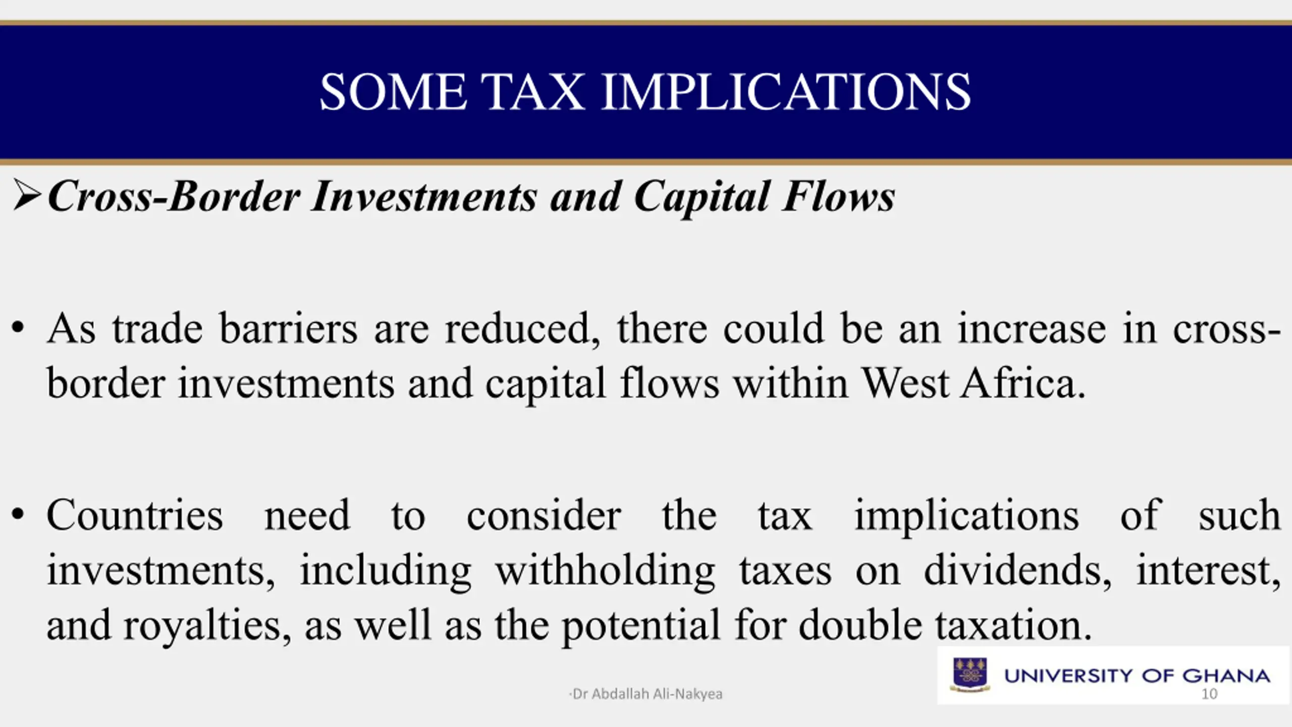 SOME TAX IMPLICATIONS Cross-Border Investments and Capital Flows As trade barriers are reduced, there could be an increase in cross- border investments and capital flows within West Africa. Countries need to consider the tax implications of such investments, including withholding taxes on dividends, interest, and royalties, as well as the potential for double taxation. Dr Abdallah Ali-Nakyea 10