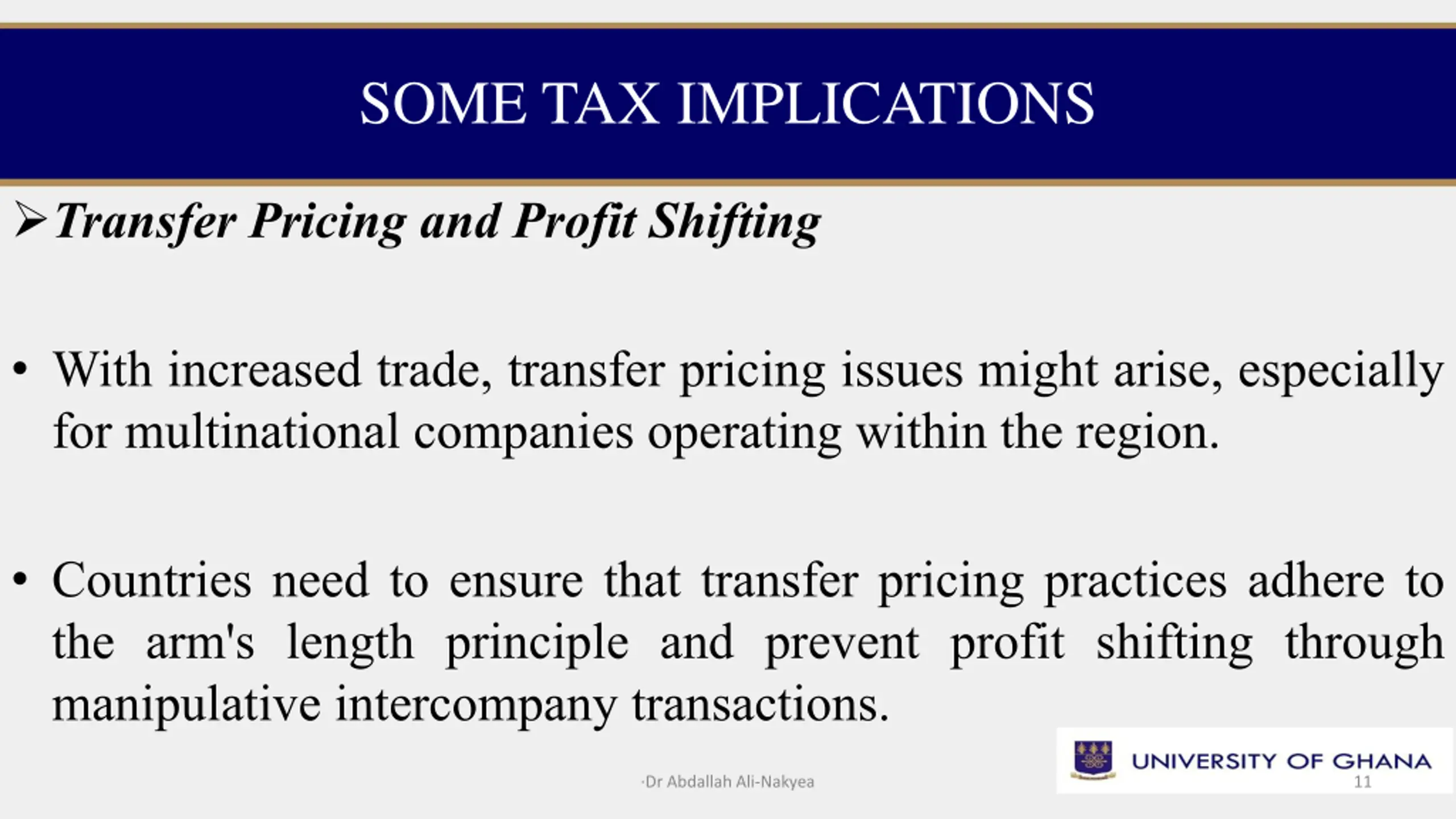 SOME TAX IMPLICATIONS Transfer Pricing and Profit Shifting With increased trade, transfer pricing issues might arise, especially for multinational companies operating within the region. Countries need to ensure that transfer pricing practices adhere to the arm's length principle and prevent profit shifting through manipulative intercompany transactions. Dr Abdallah Ali-Nakyea 11