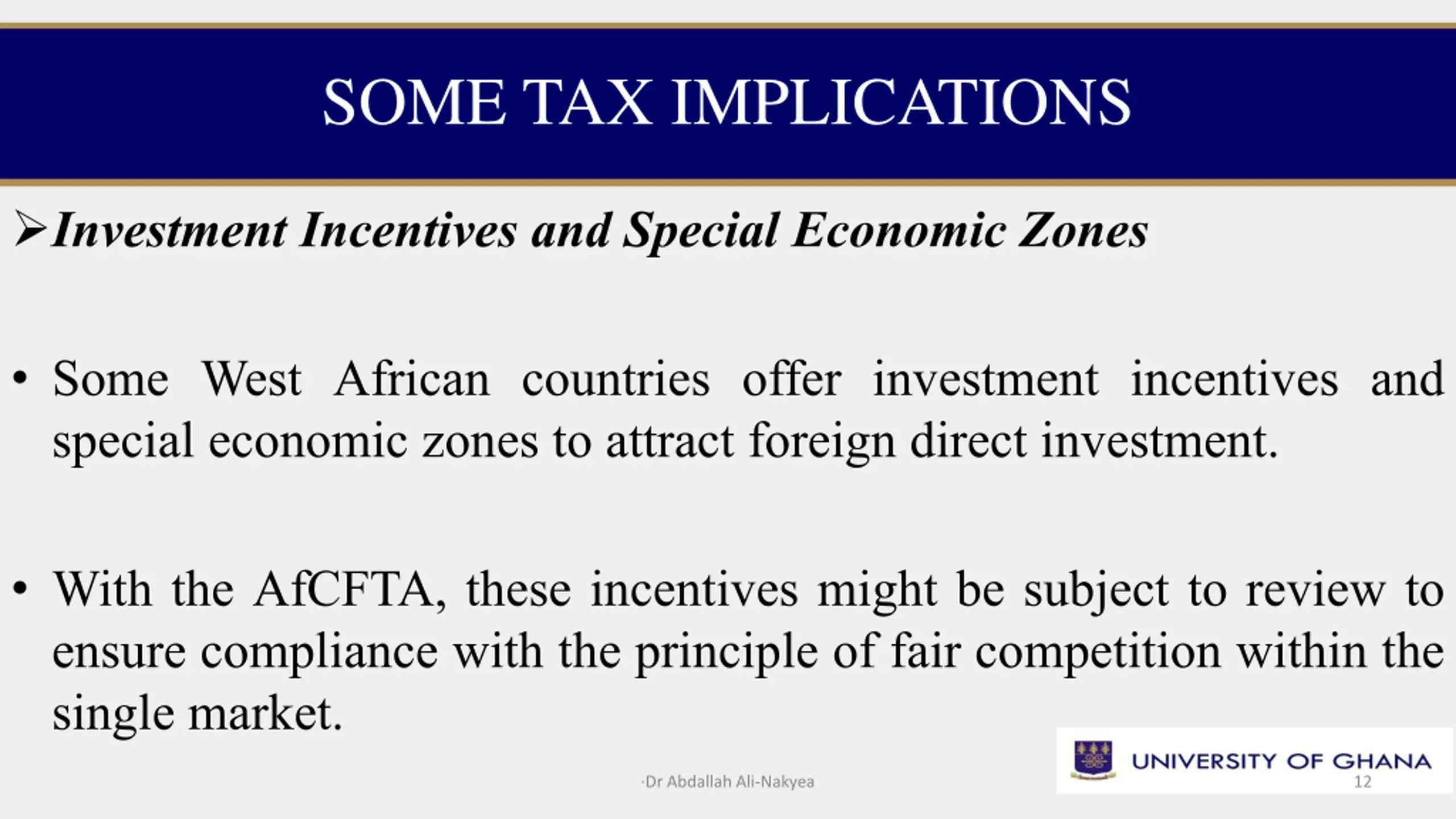 SOME TAX IMPLICATIONS Investment Incentives and Special Economic Zones Some West African countries offer investment incentives and special economic zones to attract foreign direct investment. With the AfCFTA, these incentives might be subject to review to ensure compliance with the principle of fair competition within the single market. Dr Abdallah Ali-Nakyea 12