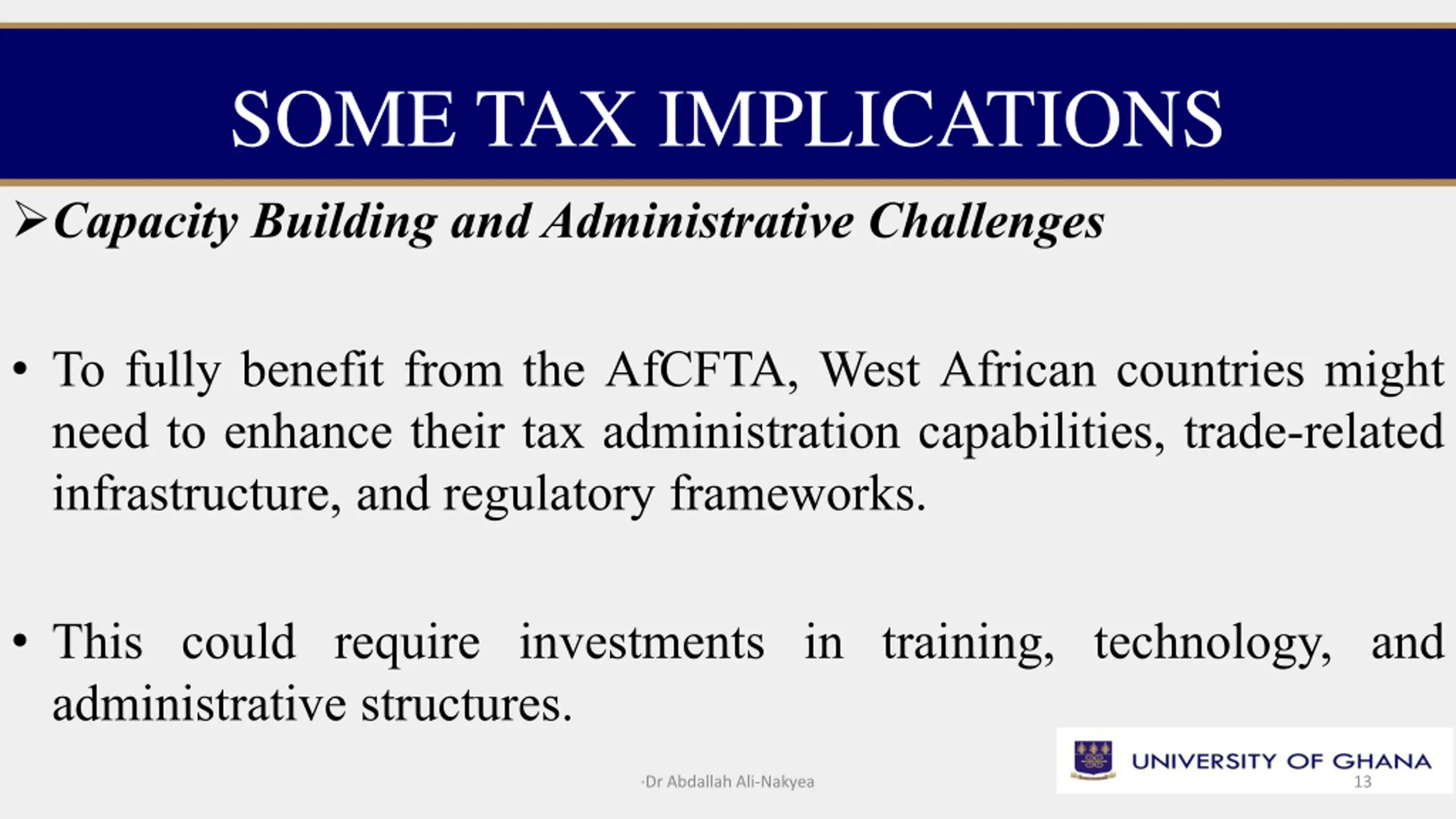 SOME TAX IMPLICATIONS Capacity Building and Administrative Challenges To fully benefit from the AfCFTA, West African countries might need to enhance their tax administration capabilities, trade-related infrastructure, and regulatory frameworks. This could require investments in training, technology, and administrative structures. Dr Abdallah Ali-Nakyea 13