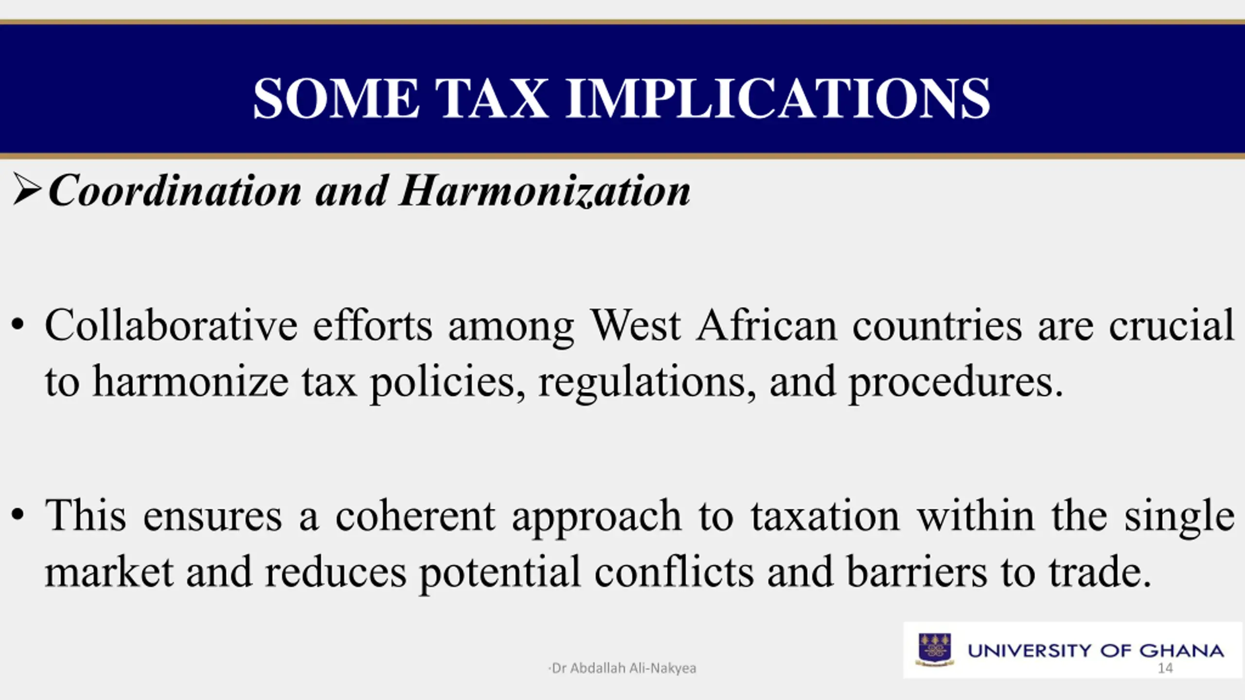 SOME TAX IMPLICATIONS Coordination and Harmonization Collaborative efforts among West African countries are crucial to harmonize tax policies, regulations, and procedures. This ensures a coherent approach to taxation within the single market and reduces potential conflicts and barriers to trade. Dr Abdallah Ali-Nakyea 14