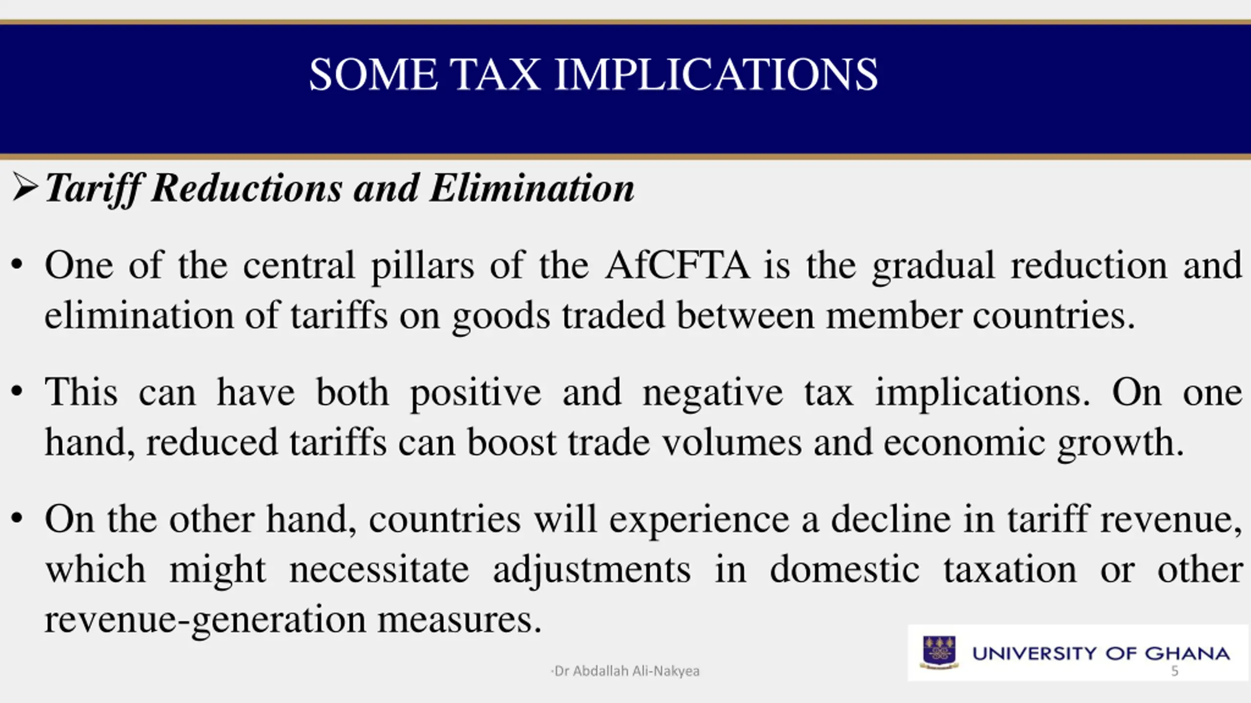 SOME TAX IMPLICATIONS Tariff Reductions and Elimination One of the central pillars of the AfCFTA is the gradual reduction and elimination of tariffs on goods traded between member countries. This can have both positive and negative tax implications. On one hand, reduced tariffs can boost trade volumes and economic growth. On the other hand, countries will experience a decline in tariff revenue, which might necessitate adjustments in domestic taxation or other revenue-generation measures. Dr Abdallah Ali-Nakyea 5
