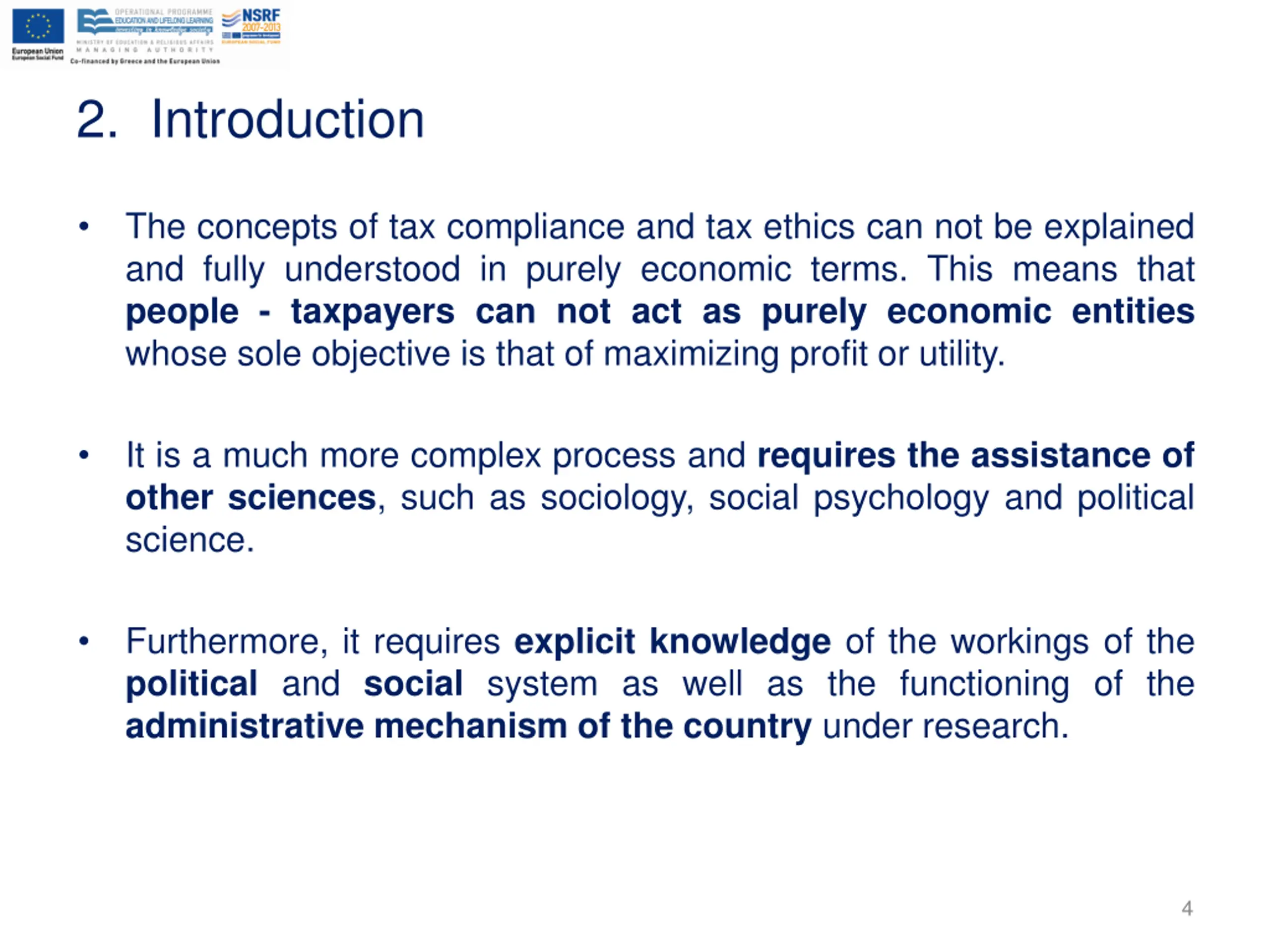 2. Introduction The concepts of tax compliance and tax ethics can not be explained and fully understood in purely economic terms. This means that people - taxpayers can not act as purely economic entities whose sole objective is that of maximizing profit or utility. It is a much more complex process and requires the assistance of other sciences, such as sociology, social psychology and political science. Furthermore, it requires explicit knowledge of the workings of the political and social system as well as the functioning of the administrative mechanism of the country under research. 4