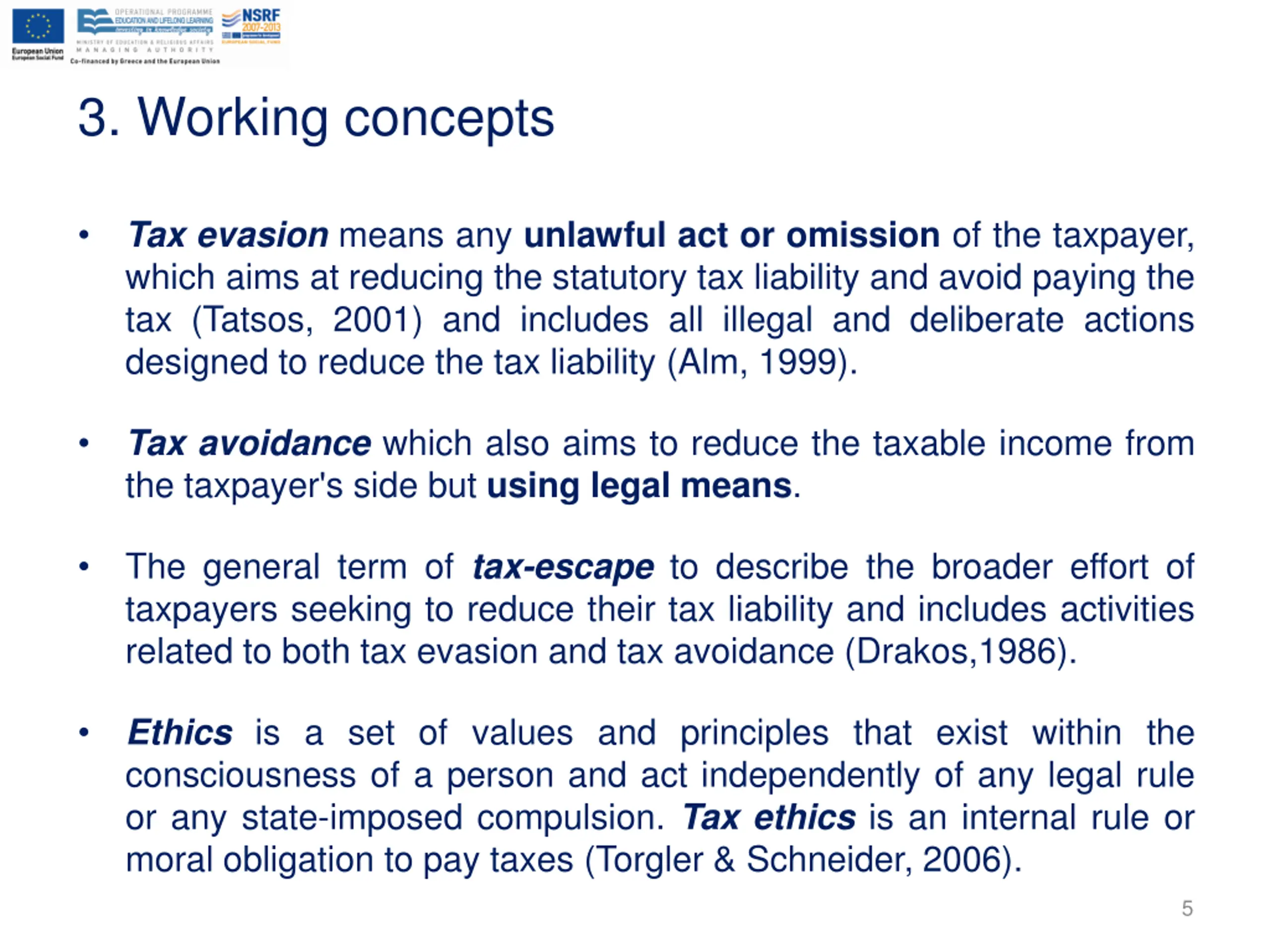 3. Working concepts Tax evasion means any unlawful act or omission of the taxpayer, which aims at reducing the statutory tax liability and avoid paying the tax (Tatsos, 2001) and includes all illegal and deliberate actions designed to reduce the tax liability (Alm, 1999). Tax avoidance which also aims to reduce the taxable income from the taxpayer's side but using legal means. The general term of tax-escape to describe the broader effort of taxpayers seeking to reduce their tax liability and includes activities related to both tax evasion and tax avoidance (Drakos,1986). Ethics is a set of values and principles that exist within the consciousness of a person and act independently of any legal rule or any state-imposed compulsion. Tax ethics is an internal rule or moral obligation to pay taxes (Torgler & Schneider, 2006). 5