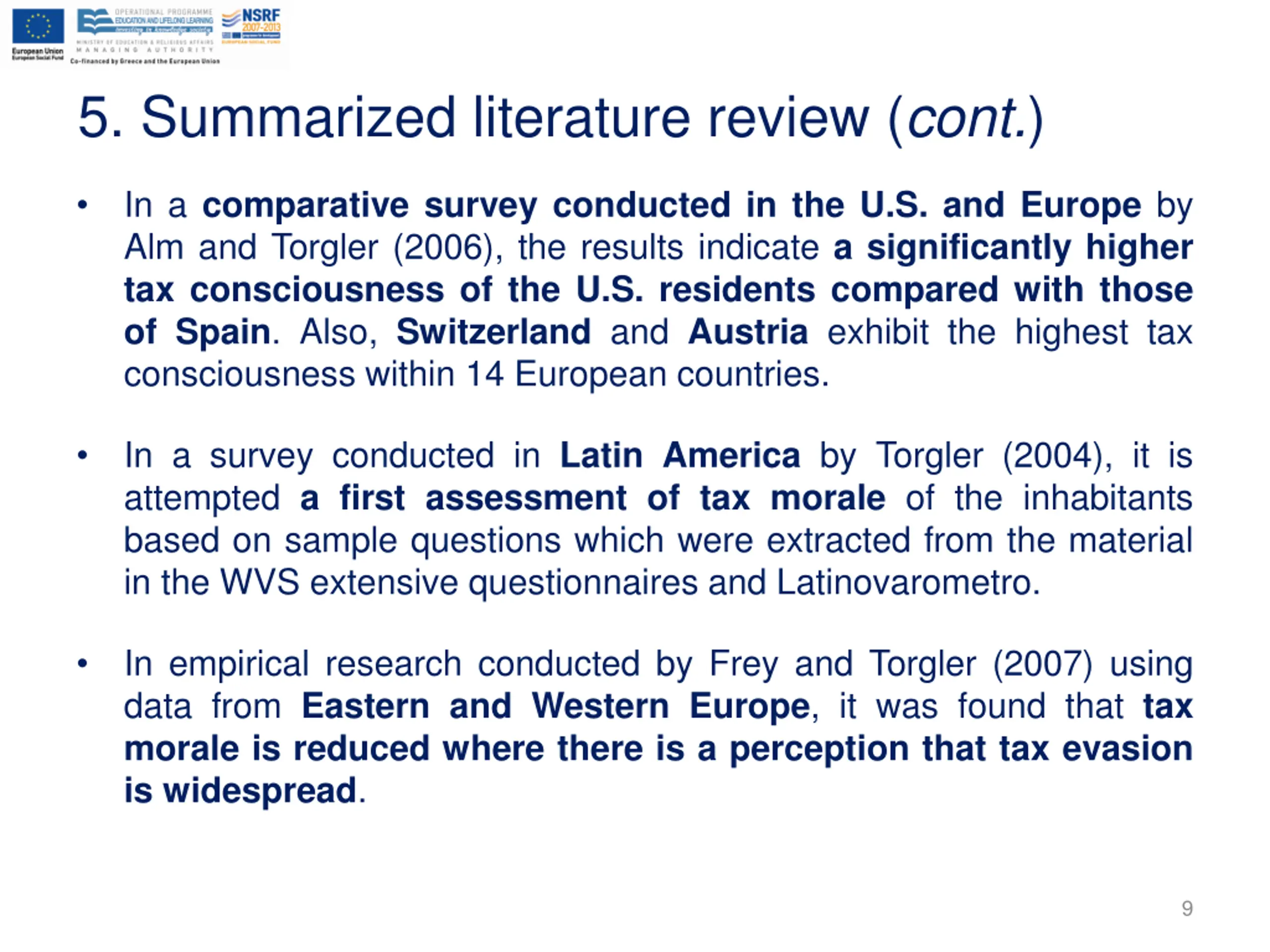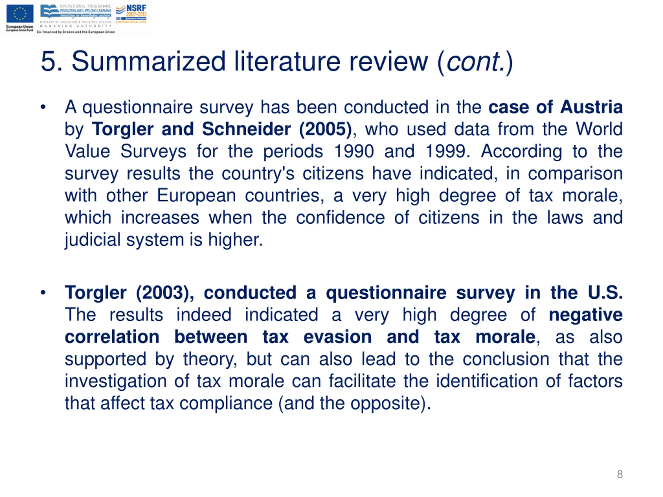 5. Summarized literature review (cont.) A questionnaire survey has been conducted in the case of Austria by Torgler and Schneider (2005), who used data from the World Value Surveys for the periods 1990 and 1999. According to the survey results the country's citizens have indicated, in comparison with other European countries, a very high degree of tax morale, which increases when the confidence of citizens in the laws and judicial system is higher. Torgler (2003), conducted a questionnaire survey in the U.S. The results indeed indicated a very high degree of negative correlation between tax evasion and tax morale, as also supported by theory, but can also lead to the conclusion that the investigation of tax morale can facilitate the identification of factors that affect tax compliance (and the opposite). 8