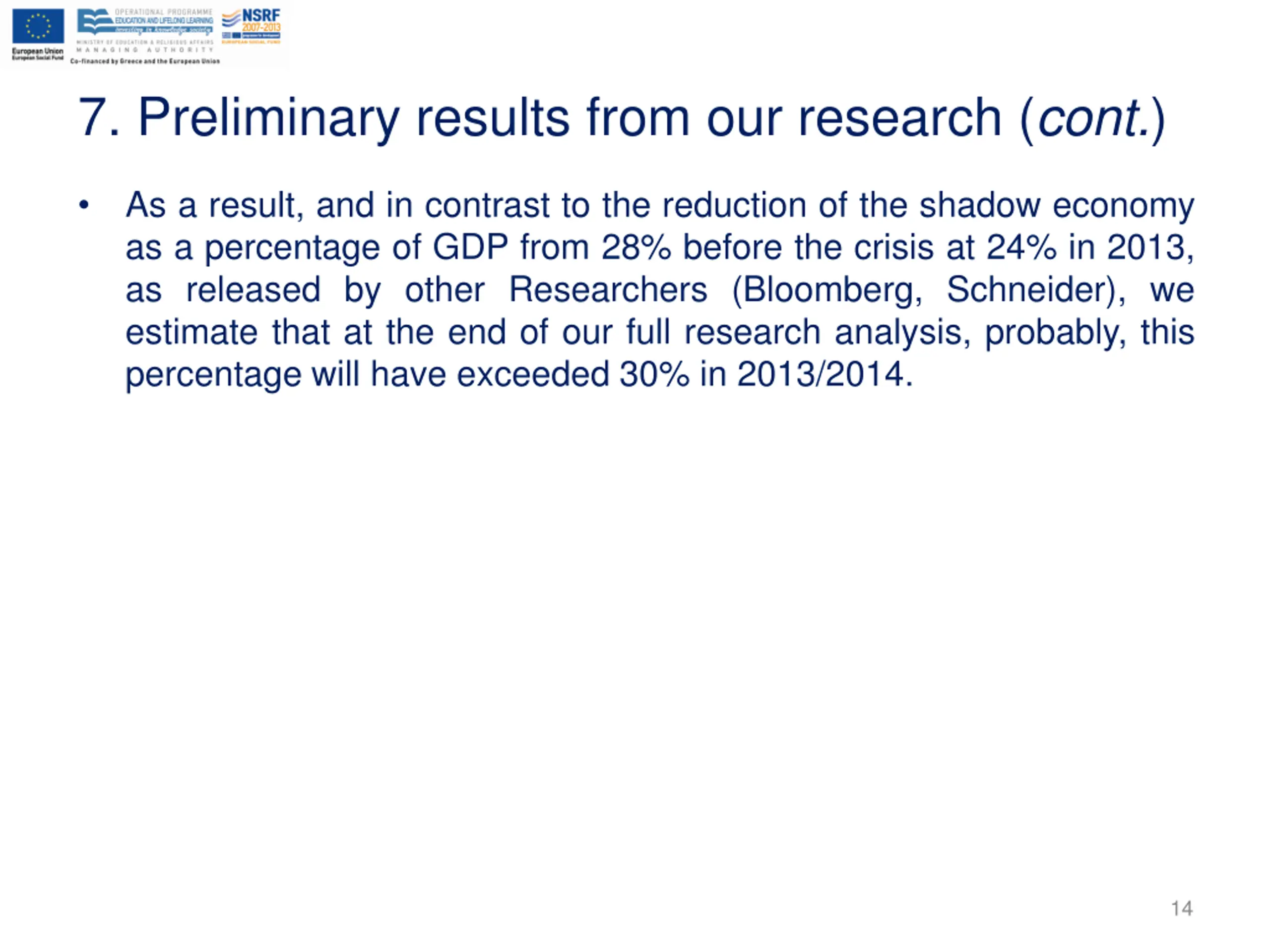 7. Preliminary results from our research (cont.) As a result, and in contrast to the reduction of the shadow economy as a percentage of GDP from 28% before the crisis at 24% in 2013, as released by other Researchers (Bloomberg, Schneider), we estimate that at the end of our full research analysis, probably, this percentage will have exceeded 30% in 2013/2014. 14