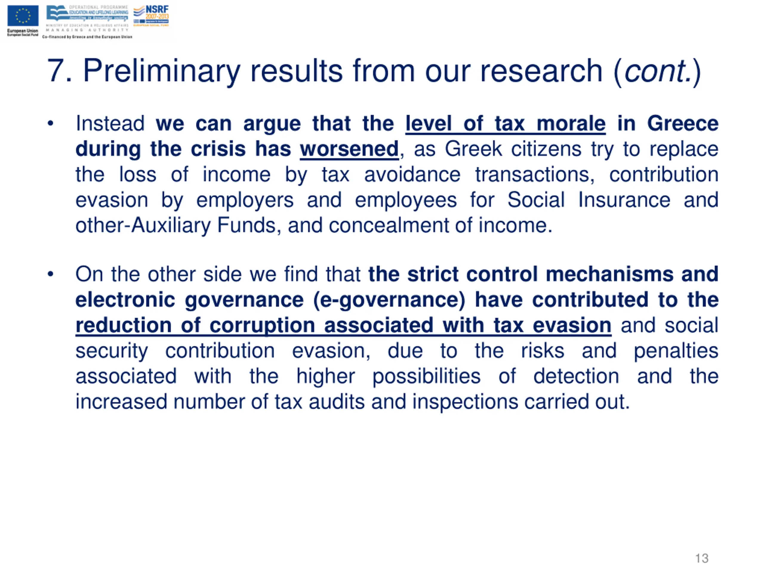 7. Preliminary results from our research (cont.) Instead we can argue that the level of tax morale in Greece during the crisis has worsened, as Greek citizens try to replace the loss of income by tax avoidance transactions, contribution evasion by employers and employees for Social Insurance and other-Auxiliary Funds, and concealment of income. On the other side we find that the strict control mechanisms and electronic governance (e-governance) have contributed to the reduction of corruption associated with tax evasion and social security contribution evasion, due to the risks and penalties associated with the higher possibilities of detection and the increased number of tax audits and inspections carried out. 13