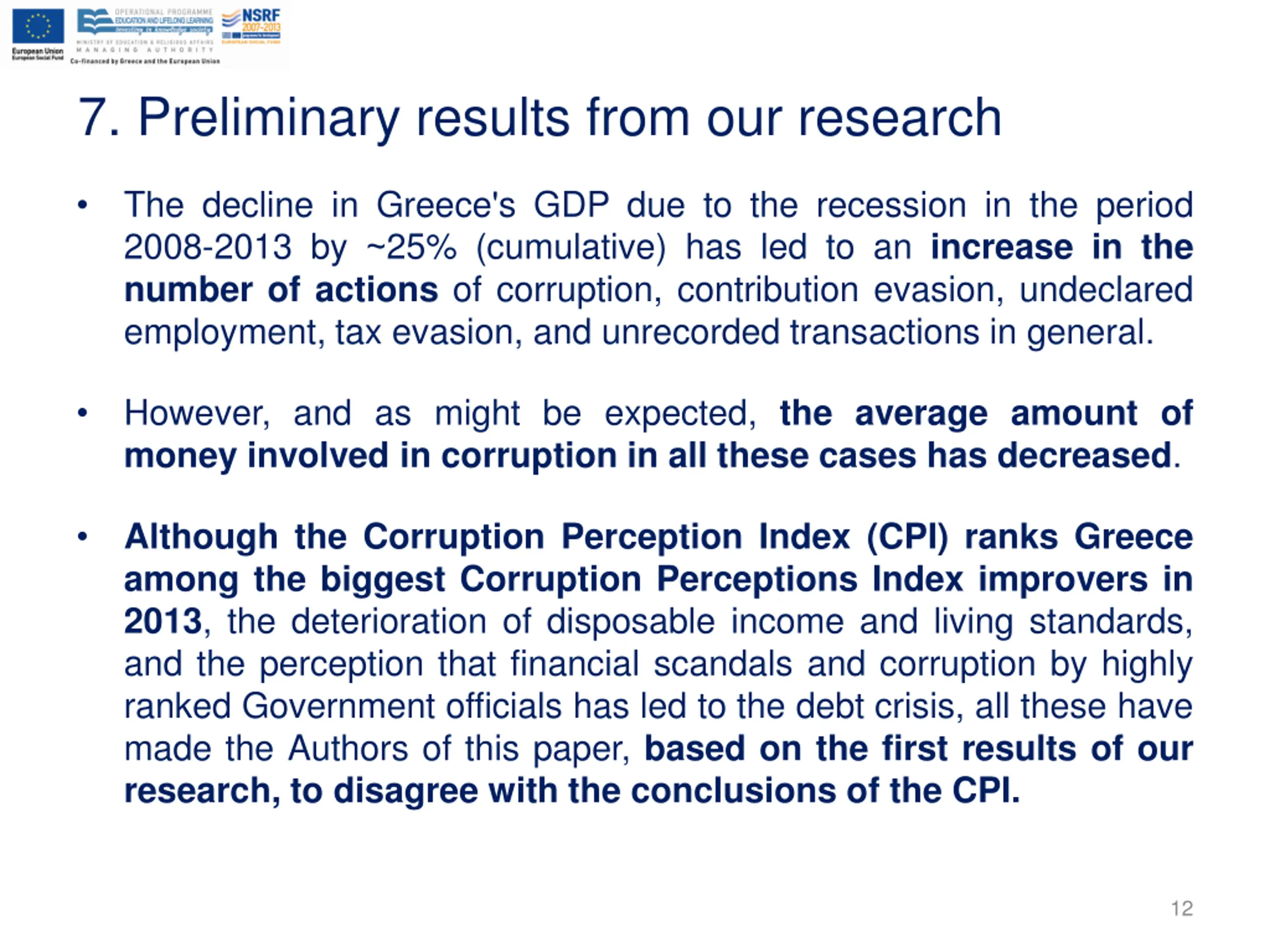 7. Preliminary results from our research The decline in Greece's GDP due to the recession in the period 2008-2013 by 25% (cumulative) has led to an increase in the number of actions of corruption, contribution evasion, undeclared employment, tax evasion, and unrecorded transactions in general. However, and as might be expected, the average amount of money involved in corruption in all these cases has decreased. Although the Corruption Perception Index (CPI) ranks Greece among the biggest Corruption Perceptions Index improvers in 2013, the deterioration of disposable income and living standards, and the perception that financial scandals and corruption by highly ranked Government officials has led to the debt crisis, all these have made the Authors of this paper, based on the first results of our research, to disagree with the conclusions of the CPI. 12