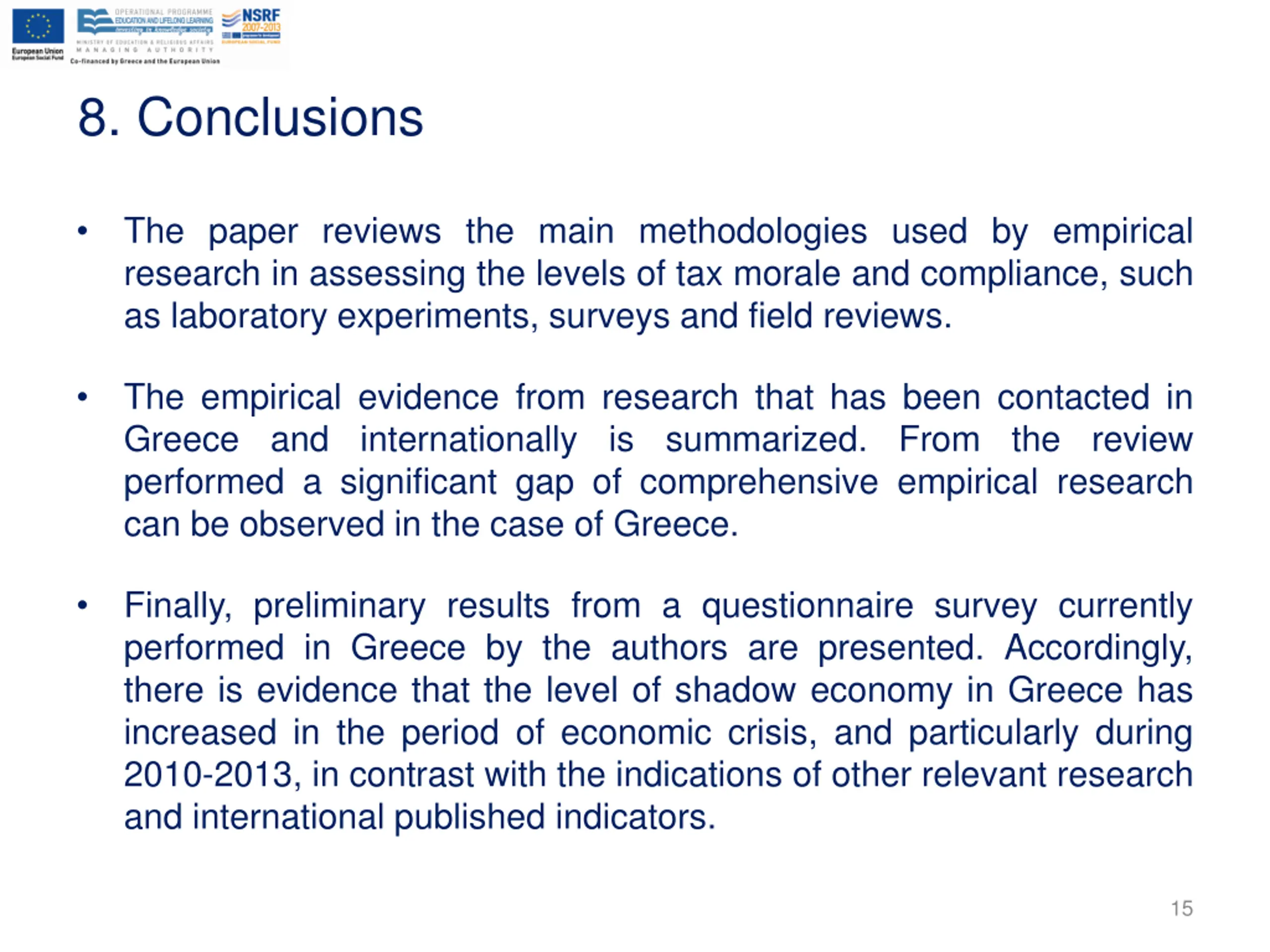8. Conclusions The paper reviews the main methodologies used by empirical research in assessing the levels of tax morale and compliance, such as laboratory experiments, surveys and field reviews. The empirical evidence from research that has been contacted in Greece and internationally is summarized. From the review performed a significant gap of comprehensive empirical research can be observed in the case of Greece. Finally, preliminary results from a questionnaire survey currently performed in Greece by the authors are presented. Accordingly, there is evidence that the level of shadow economy in Greece has increased in the period of economic crisis, and particularly during 2010-2013, in contrast with the indications of other relevant research and international published indicators. 15