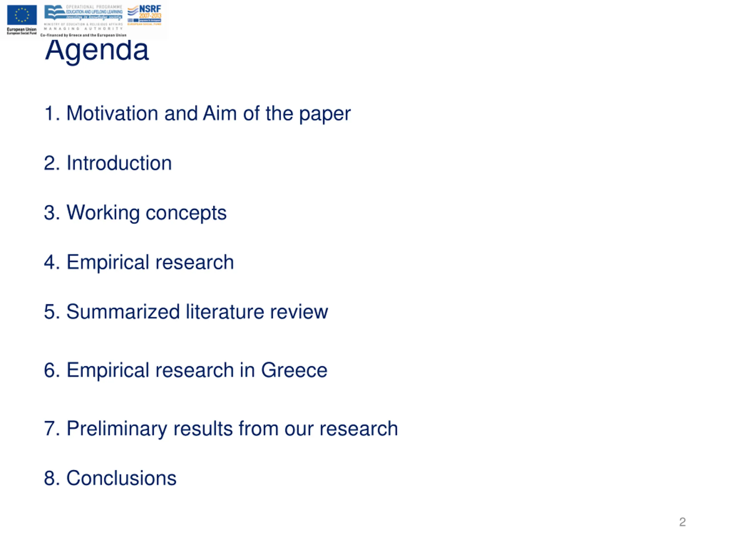 Agenda 1. Motivation and Aim of the paper 2. Introduction 3. Working concepts 4. Empirical research 5. Summarized literature review 6. Empirical research in Greece 7. Preliminary results from our research 8. Conclusions 2