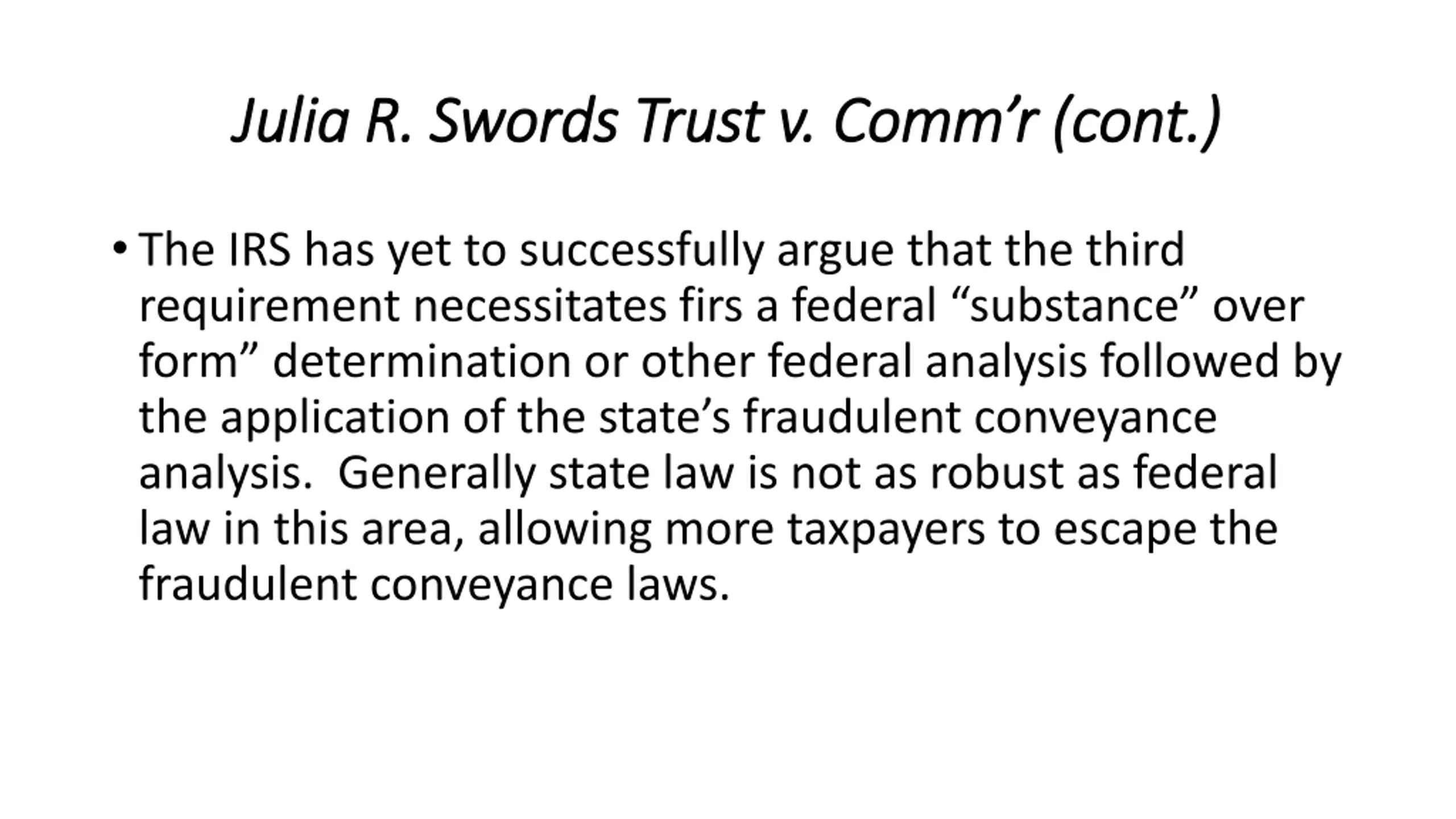 Julia R. Swords Trust v. Julia R. Swords Trust v. Comm r Comm r (cont.) (cont.) The IRS has yet to successfully argue that the third requirement necessitates firs a federal substance over form determination or other federal analysis followed by the application of the state s fraudulent conveyance analysis. Generally state law is not as robust as federal law in this area, allowing more taxpayers to escape the fraudulent conveyance laws.