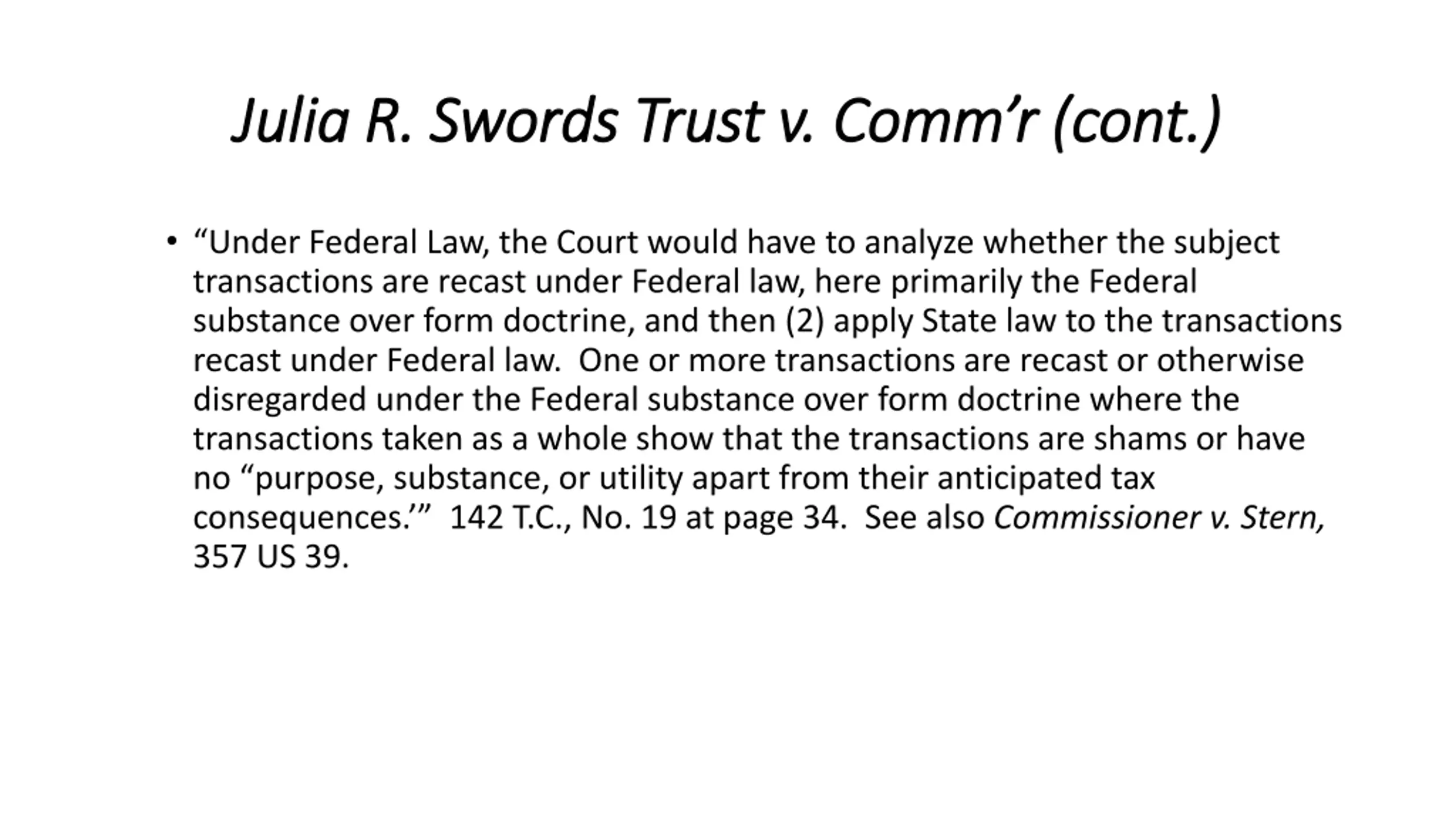 Julia R. Swords Trust v. Julia R. Swords Trust v. Comm r Comm r (cont.) (cont.) Under Federal Law, the Court would have to analyze whether the subject transactions are recast under Federal law, here primarily the Federal substance over form doctrine, and then (2) apply State law to the transactions recast under Federal law. One or more transactions are recast or otherwise disregarded under the Federal substance over form doctrine where the transactions taken as a whole show that the transactions are shams or have no purpose, substance, or utility apart from their anticipated tax consequences. 142 T.C., No. 19 at page 34. See also Commissioner v. Stern, 357 US 39.