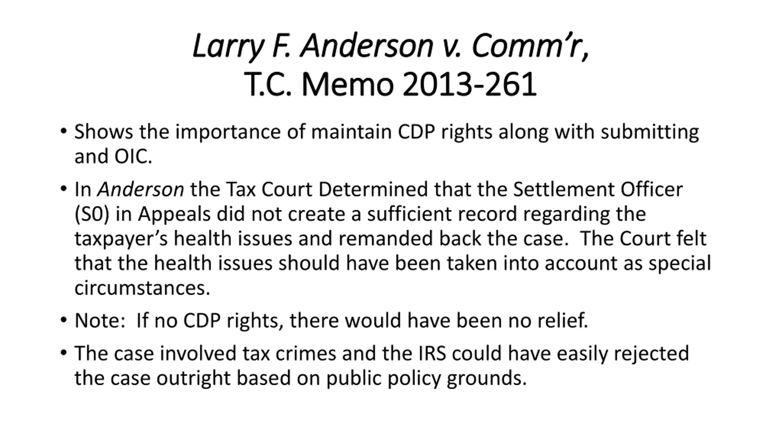 Larry F. Anderson v. Larry F. Anderson v. Comm r T.C. Memo 2013 T.C. Memo 2013- -261 Comm r, , 261 Shows the importance of maintain CDP rights along with submitting and OIC. In Anderson the Tax Court Determined that the Settlement Officer (S0) in Appeals did not create a sufficient record regarding the taxpayer s health issues and remanded back the case. The Court felt that the health issues should have been taken into account as special circumstances. Note: If no CDP rights, there would have been no relief. The case involved tax crimes and the IRS could have easily rejected the case outright based on public policy grounds.