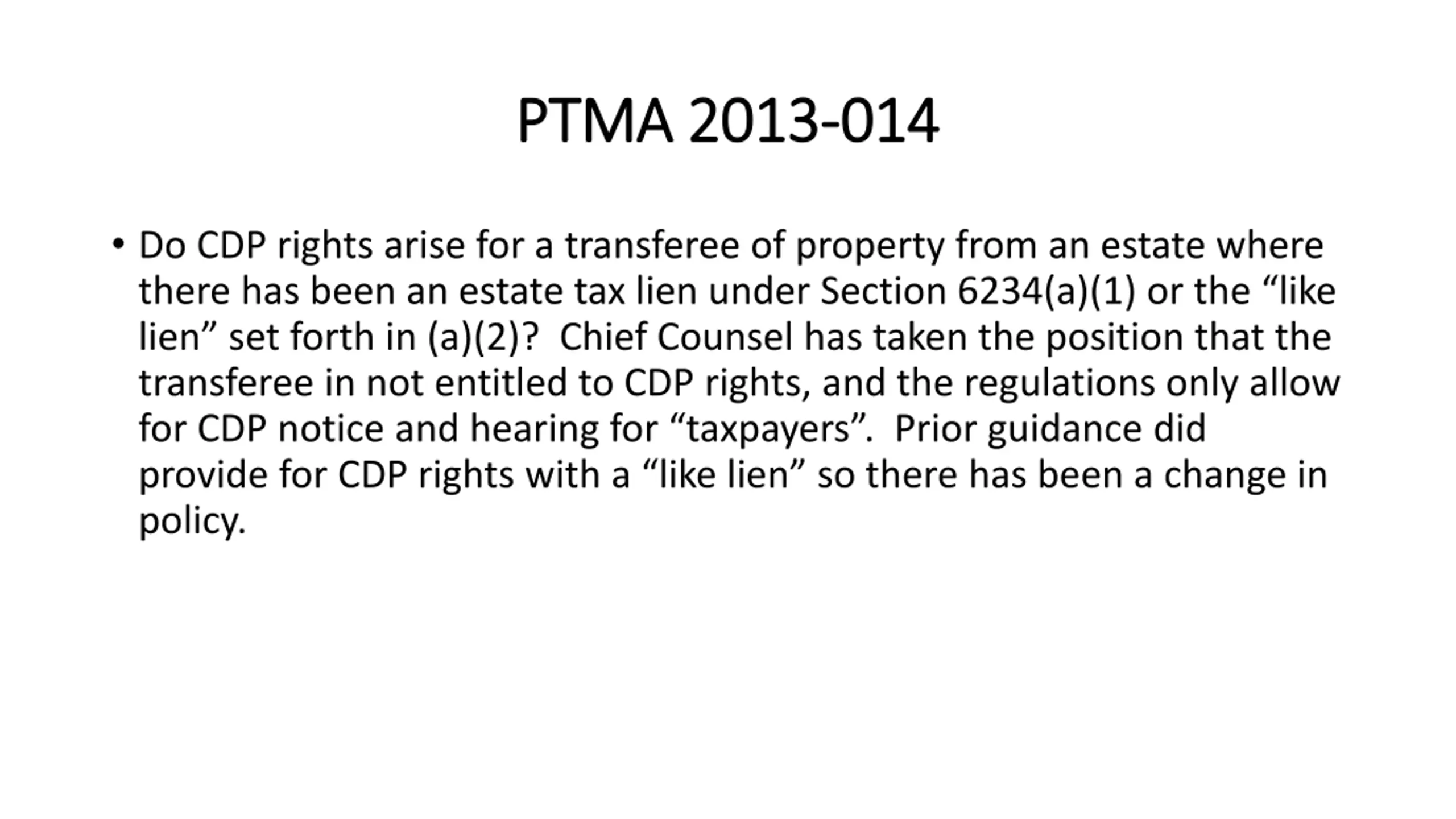 PTMA 2013 PTMA 2013- -014 014 Do CDP rights arise for a transferee of property from an estate where there has been an estate tax lien under Section 6234(a)(1) or the like lien set forth in (a)(2)? Chief Counsel has taken the position that the transferee in not entitled to CDP rights, and the regulations only allow for CDP notice and hearing for taxpayers . Prior guidance did provide for CDP rights with a like lien so there has been a change in policy.
