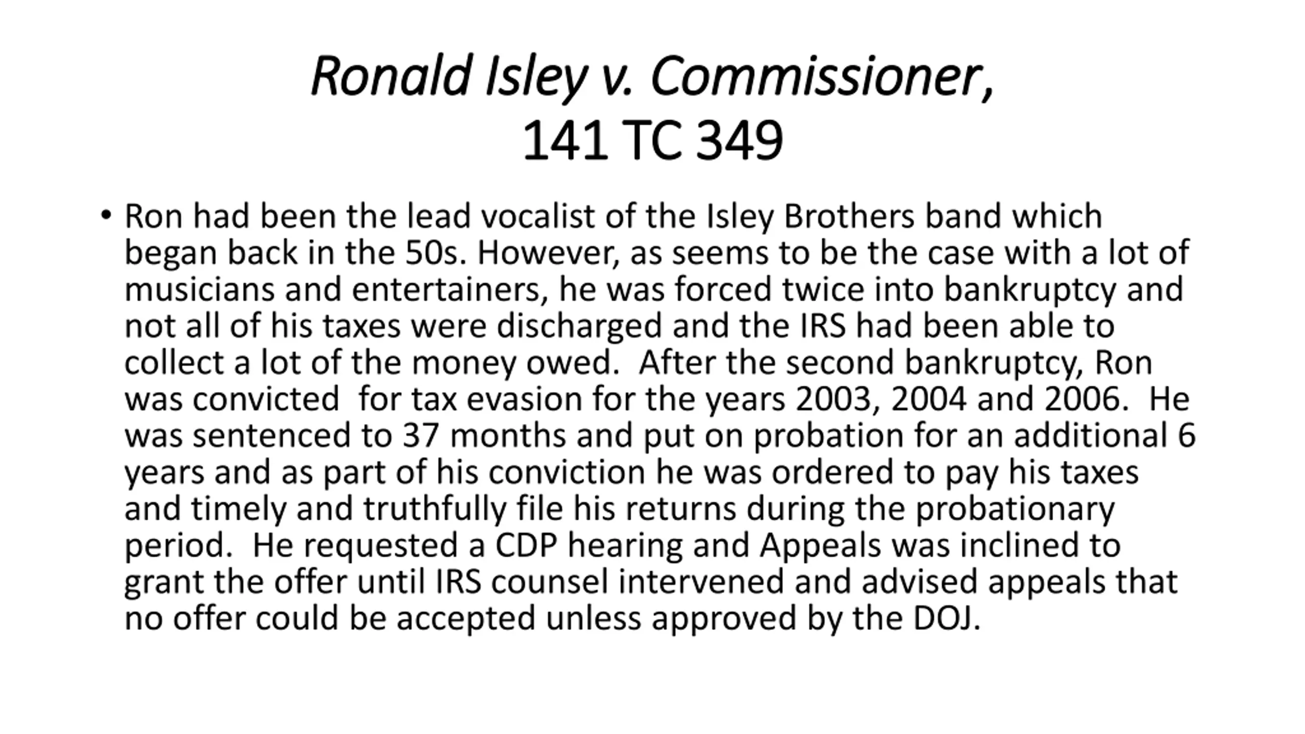 Ronald Ronald Isley Isley v. Commissioner v. Commissioner, , 141 TC 349 141 TC 349 Ron had been the lead vocalist of the Isley Brothers band which began back in the 50s. However, as seems to be the case with a lot of musicians and entertainers, he was forced twice into bankruptcy and not all of his taxes were discharged and the IRS had been able to collect a lot of the money owed. After the second bankruptcy, Ron was convicted for tax evasion for the years 2003, 2004 and 2006. He was sentenced to 37 months and put on probation for an additional 6 years and as part of his conviction he was ordered to pay his taxes and timely and truthfully file his returns during the probationary period. He requested a CDP hearing and Appeals was inclined to grant the offer until IRS counsel intervened and advised appeals that no offer could be accepted unless approved by the DOJ.
