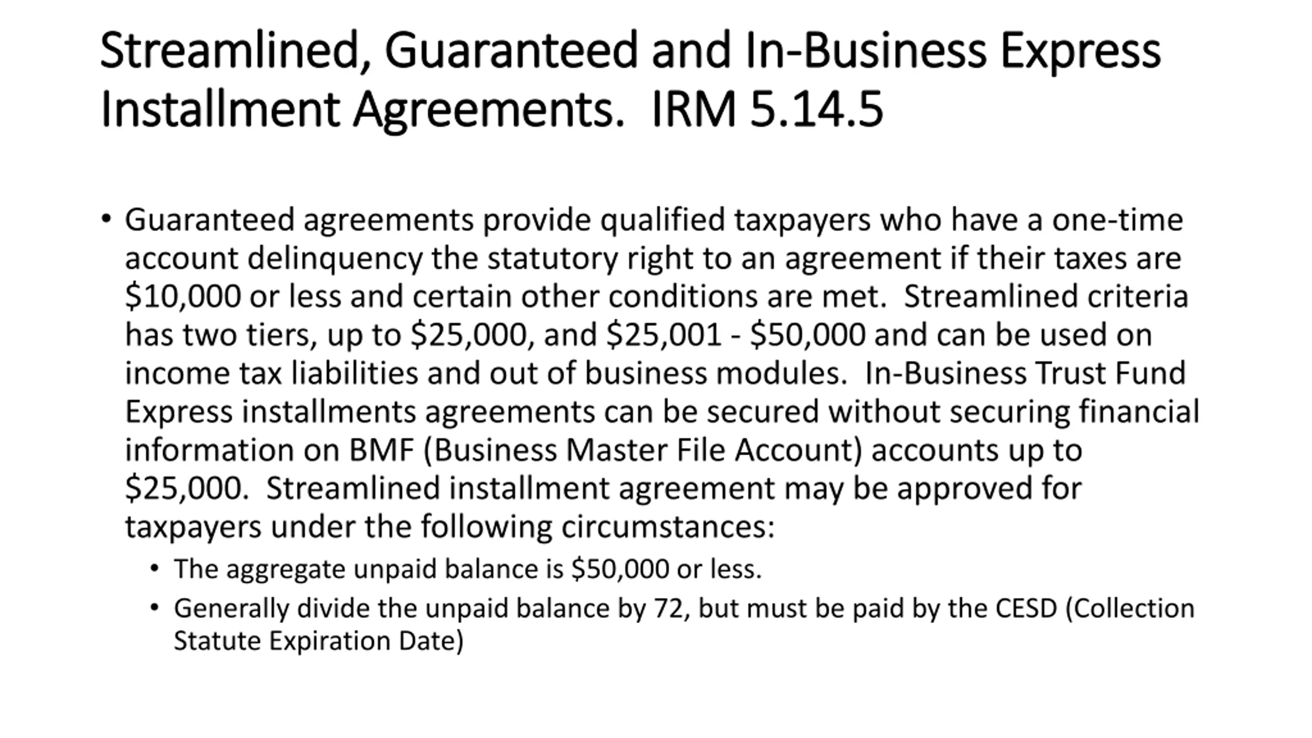 Streamlined, Guaranteed and In Streamlined, Guaranteed and In- -Business Express Installment Agreements. IRM 5.14.5 Installment Agreements. IRM 5.14.5 Business Express Guaranteed agreements provide qualified taxpayers who have a one-time account delinquency the statutory right to an agreement if their taxes are $10,000 or less and certain other conditions are met. Streamlined criteria has two tiers, up to $25,000, and $25,001 - $50,000 and can be used on income tax liabilities and out of business modules. In-Business Trust Fund Express installments agreements can be secured without securing financial information on BMF (Business Master File Account) accounts up to $25,000. Streamlined installment agreement may be approved for taxpayers under the following circumstances: The aggregate unpaid balance is $50,000 or less. Generally divide the unpaid balance by 72, but must be paid by the CESD (Collection Statute Expiration Date)