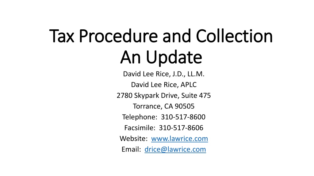 Tax Procedure and Collection Tax Procedure and Collection An Update An Update David Lee Rice, J.D., LL.M. David Lee Rice, APLC 2780 Skypark Drive, Suite 475 Torrance, CA 90505 Telephone: 310-517-8600 Facsimile: 310-517-8606 Website: www.lawrice.com Email: drice@lawrice.com