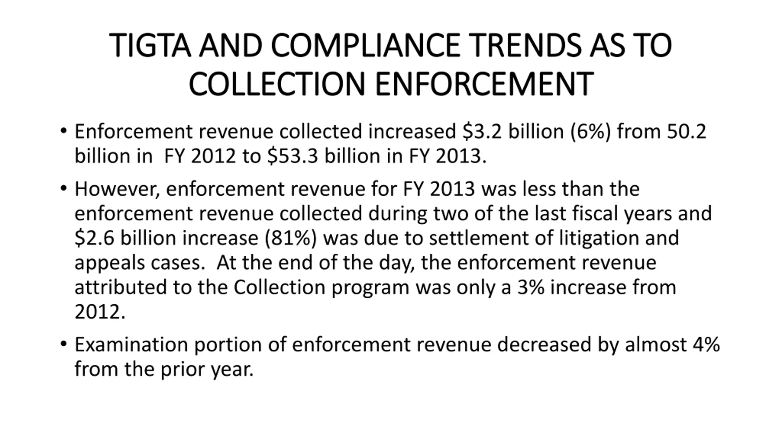 TIGTA AND COMPLIANCE TRENDS AS TO TIGTA AND COMPLIANCE TRENDS AS TO COLLECTION ENFORCEMENT COLLECTION ENFORCEMENT Enforcement revenue collected increased $3.2 billion (6%) from 50.2 billion in FY 2012 to $53.3 billion in FY 2013. However, enforcement revenue for FY 2013 was less than the enforcement revenue collected during two of the last fiscal years and $2.6 billion increase (81%) was due to settlement of litigation and appeals cases. At the end of the day, the enforcement revenue attributed to the Collection program was only a 3% increase from 2012. Examination portion of enforcement revenue decreased by almost 4% from the prior year.