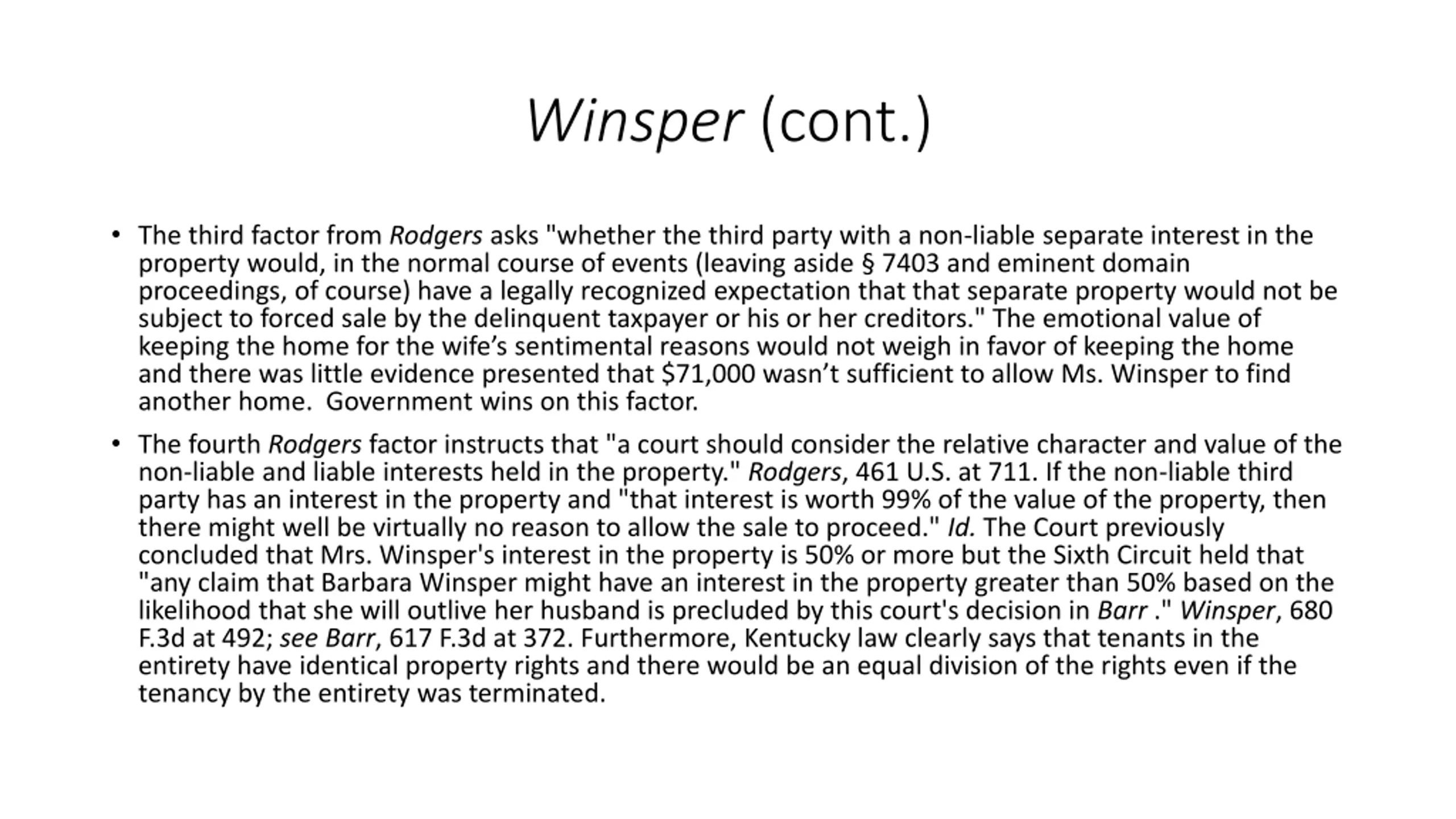 Winsper (cont.) The third factor from Rodgers asks "whether the third party with a non-liable separate interest in the property would, in the normal course of events (leaving aside 7403 and eminent domain proceedings, of course) have a legally recognized expectation that that separate property would not be subject to forced sale by the delinquent taxpayer or his or her creditors." The emotional value of keeping the home for the wife s sentimental reasons would not weigh in favor of keeping the home and there was little evidence presented that $71,000 wasn t sufficient to allow Ms. Winsper to find another home. Government wins on this factor. The fourth Rodgers factor instructs that "a court should consider the relative character and value of the non-liable and liable interests held in the property." Rodgers, 461 U.S. at 711. If the non-liable third party has an interest in the property and "that interest is worth 99% of the value of the property, then there might well be virtually no reason to allow the sale to proceed." Id. The Court previously concluded that Mrs. Winsper's interest in the property is 50% or more but the Sixth Circuit held that "any claim that Barbara Winsper might have an interest in the property greater than 50% based on the likelihood that she will outlive her husband is precluded by this court's decision in Barr ." Winsper, 680 F.3d at 492; see Barr, 617 F.3d at 372. Furthermore, Kentucky law clearly says that tenants in the entirety have identical property rights and there would be an equal division of the rights even if the tenancy by the entirety was terminated.