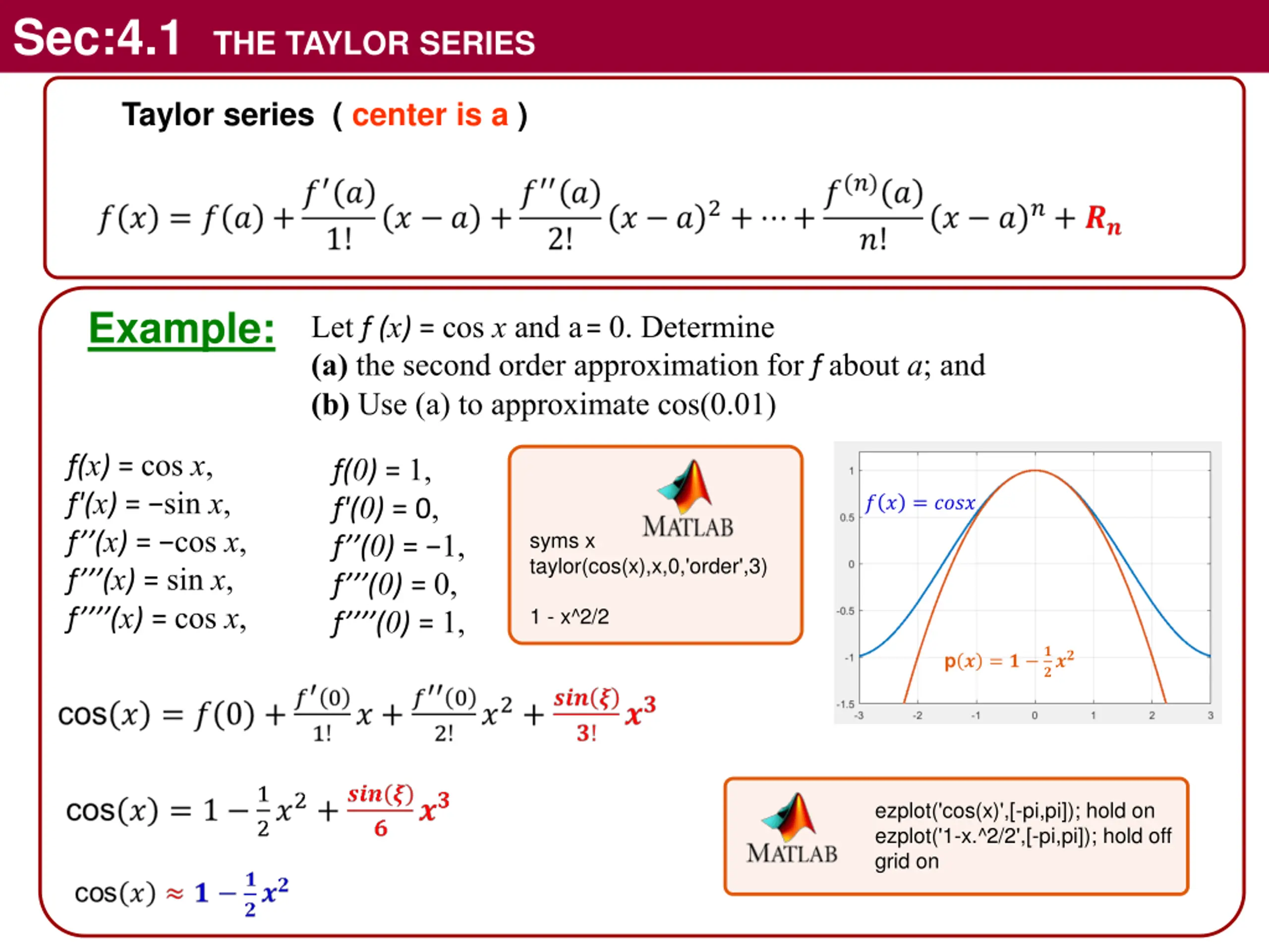 Sec:4.1 THE TAYLOR SERIES Taylor series ( center is a ) Example: Let f (x) = cos x and a= 0. Determine (a) the second order approximation for f about a; and (b) Use (a) to approximate cos(0.01) f(x) = cos x, f'(x) = sin x, f (x) = cos x, f (x) = sin x, f (x) = cos x, f(0) = 1, f'(0) = 0, f (0) = 1, f (0) = 0, f (0) = 1, ? ? = ???? syms x taylor(cos(x),x,0,'order',3) 1 - x^2/2 p ? = ? ? ??? ezplot('cos(x)',[-pi,pi]); hold on ezplot('1-x.^2/2',[-pi,pi]); hold off grid on
